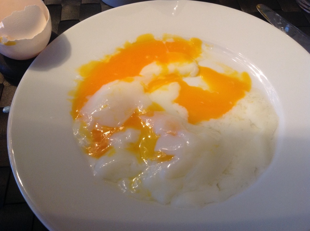 «Eggene må bade lengre» sa Lisa…og vips så var eggene tilbake i sviddå! Etter 1 time og 14 minutter ble resultatet sånn og jeg tenkte i mitt stille sinn: «Lenge leve egg kokeren som vi fikk av Markus til jul»:-) Den funker definitivt bedre til frokostegg enn sviddå… Kanskje jeg prøver dette igjen, men da med høyere temperatur!