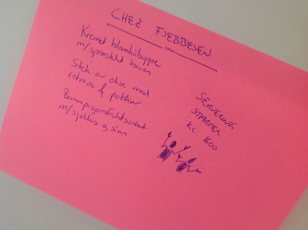 What a great Sunday dinner experience this turned out to be. Below is the invitation that was sent to the Munkviks and it certainly set off high levels of expectations, at least I thought so when receiving the text message responses. As a responsible and accountable amateur chef I had everything under control of course… While the house was invaded by curious and «eager to get to the table» guests I was well under way of preparing this three course dinner:-)