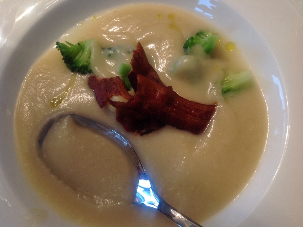 The soup first: with 6-8 guests you will need 2 cauliflowers, 1 broccoli, 1 leek, 1 yellow onion, bacon, 8 dl of vegetable stock. Divide cauliflower in small bouquets and fry in deep pan with the white part of the leek and chopped onion. Pour in the stock and let boil until cauliflower is tender. Pour info blender and blender until nice and smooth texture. Fry pieces of bacon and let it dry out on paper to great crispness. Put broccoli in small pieces in pan of boiling salted water and leave for a minute. Strain and place a few broccoli bouquets in the soup plates. Season with salt and pepper. Pour the soup over, place a couple of pieces of bacon on top and some fresh thyme.