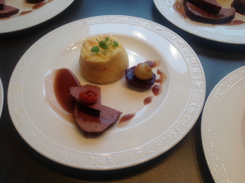 To kick off the sauce you start with a sliced shallot. Fry in pan and add 2 dl of port wine. Reduce to 1/3. Add 5 dl of ox stock and reduce to the half. When meat is done add one dl of jus to the sauce and let boil until it thickens. Regulate taste with pepper and salt.