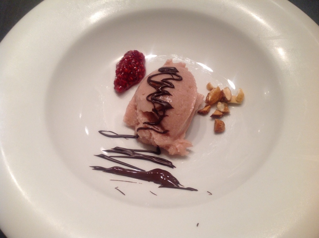 The grand finale which everyone enjoyed to the fullest – passion fruit and banana sorbet (which I chose to color pink only because it looked better :-)). Meat from 4 passion fruits, 6 ripe bananas, 2,5 dl milk, syrup of 2,5 dl sugar and equally amount of water. Cool the syrup and add it all int your blender. Pass it through a sieve and run in an ice cream machine to the perfect consistence. Keep in freezer until serving. Melt dark chocolate over water bath, chop variety of nuts and make a straight forward raspberry sauce (raspberry and sugar to boil until right thickness).