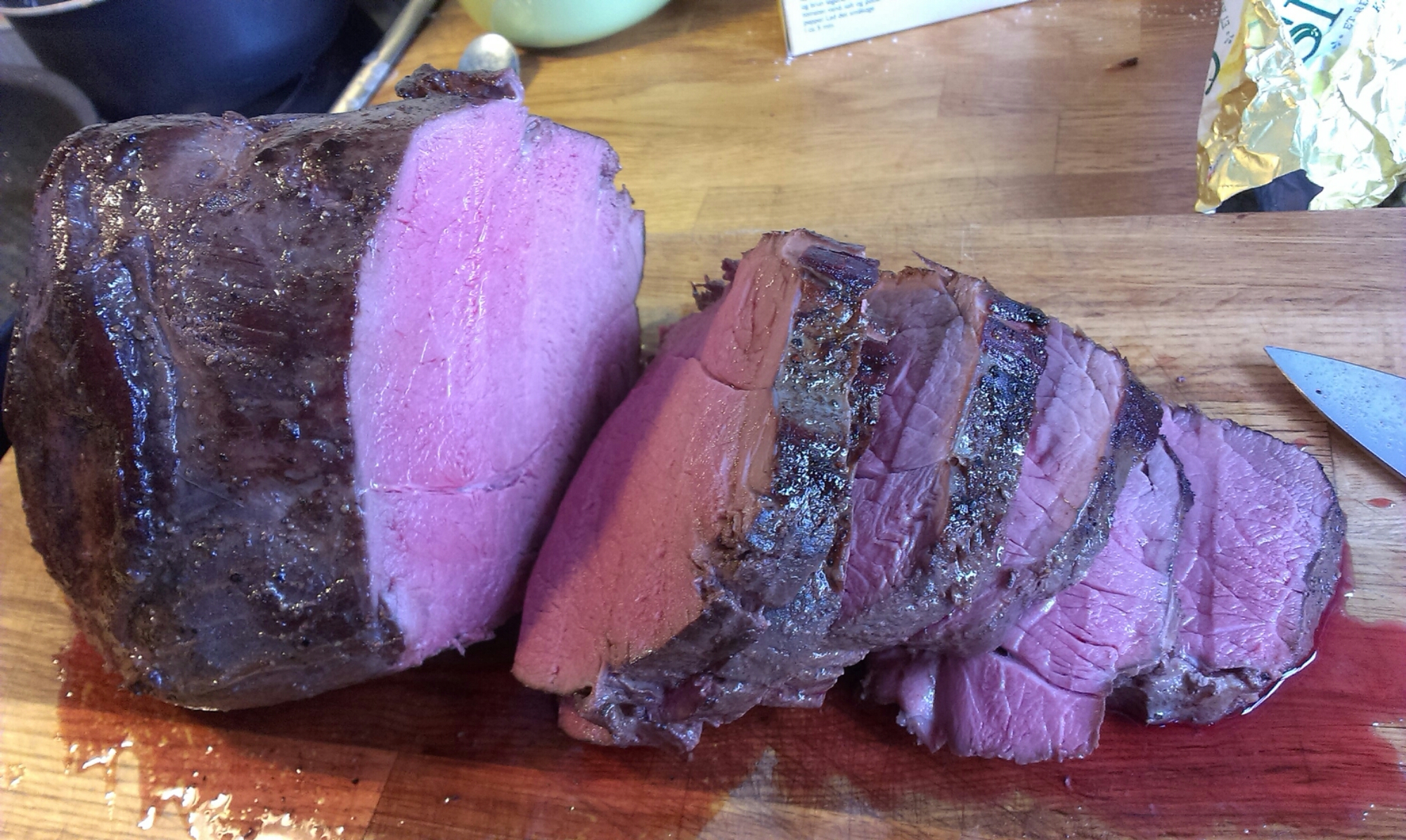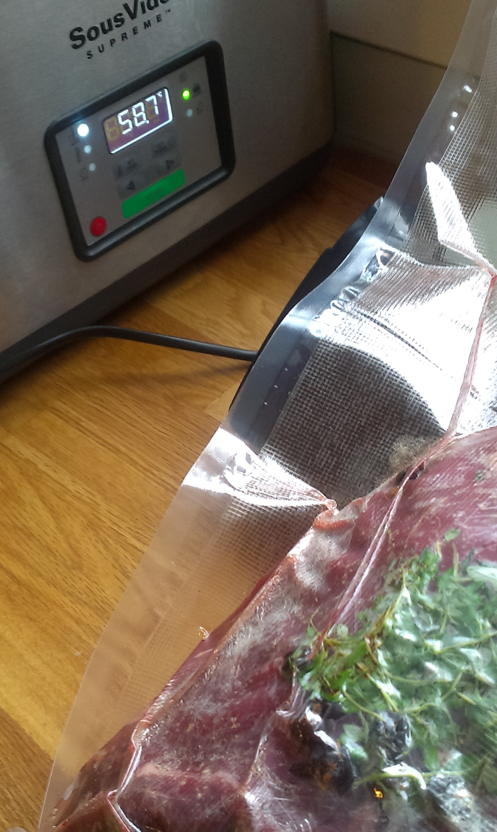 Badetempen ble stilt inn på 59 grader og elgsteken ble vakumert med salt, pepper, et par spiseskjeer olivenolje og 8 knuste einebær.