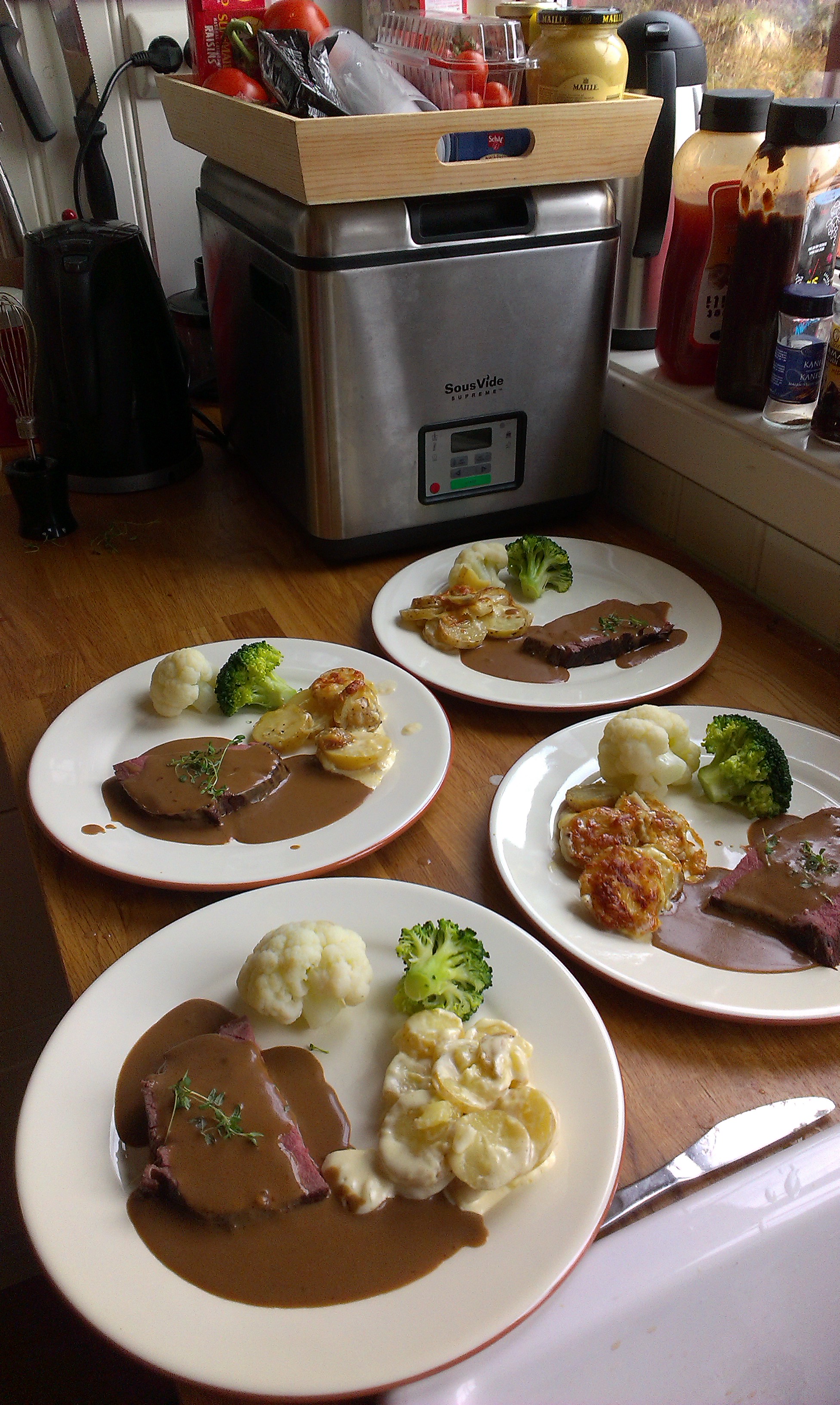 Elgen stupte uti kl 11.23 og ble plukket opp kl 16.19. Væsken ble brukt i viltsausen og steken ble svidd i pannen på høy varme med godt smør. Resultatet ble mirakuløst – god tygge konsistens, fantastisk mørhet og en uimotståelig saftighet!