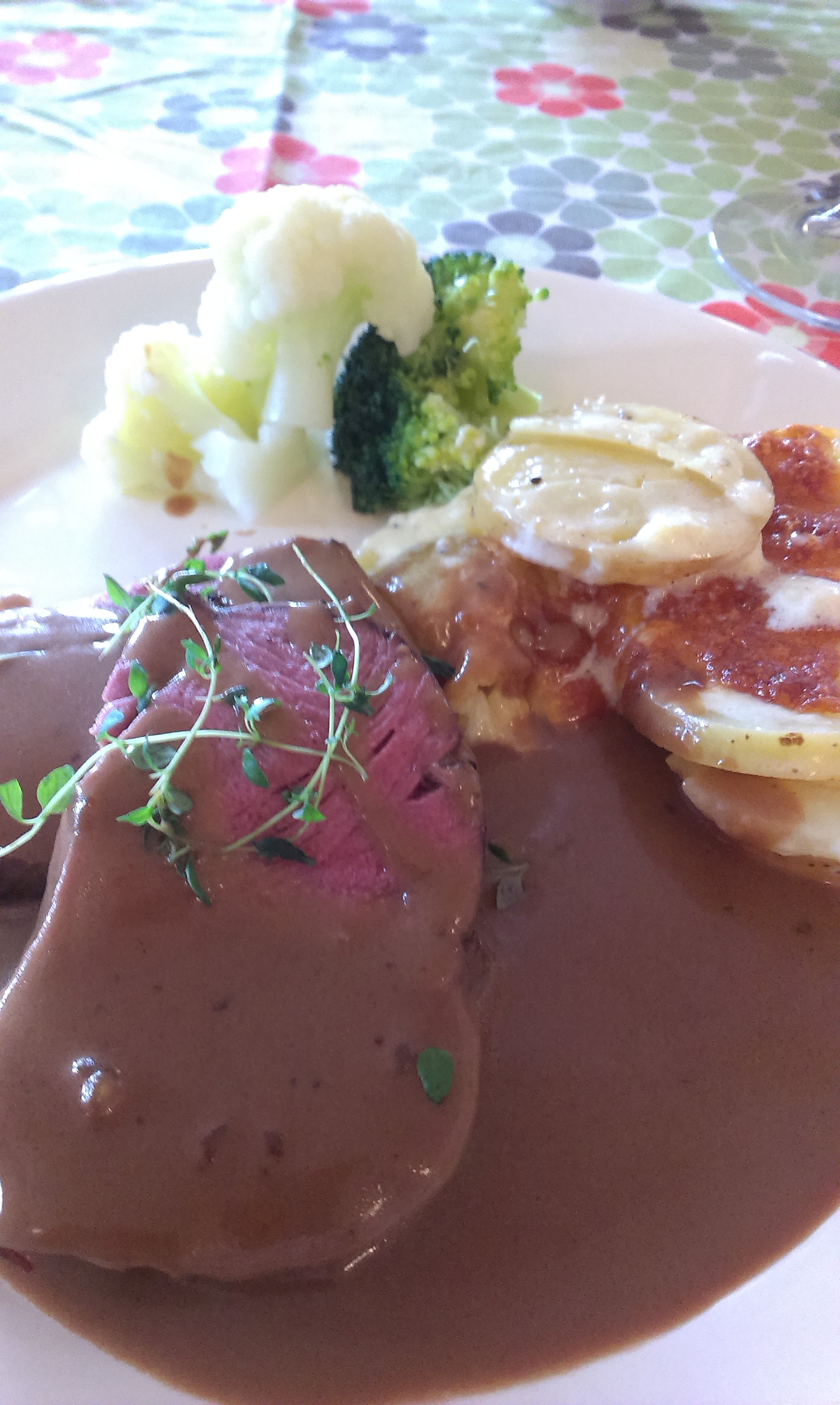 Trude stod for tilbehøret. Nydelige fløtegratinerte poteter, brokkoli, blomkål, en utrolig god viltsaus og tyttebærsyltetøy….mmmmm!
