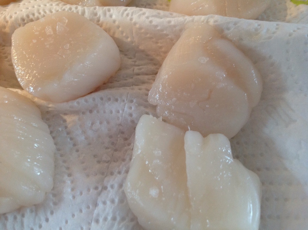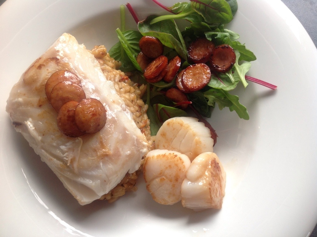 Torskefilet, kamskjell, salat, risotto, chorizo pølse, smør, parmesan, salt og pepper.
