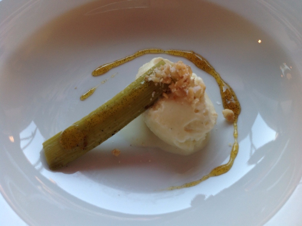 Ta ut stengene fra posen og hell væsken i en gryte. La denne koke inn til sirup. Montér en kule is i dyp tallerken, legg på en stang sous vide rabarbra, pynt med en blanding av hakkete valnøtter og salt. Drypp til slutt på den herlig, syrlige rabarbra sirupen. Sånn: