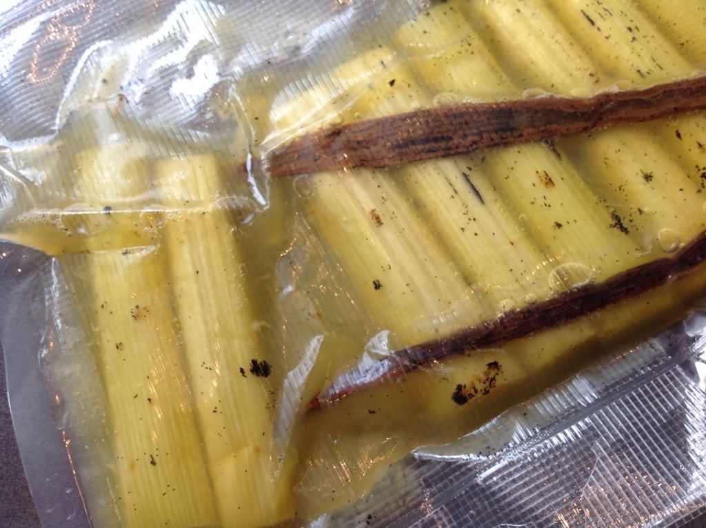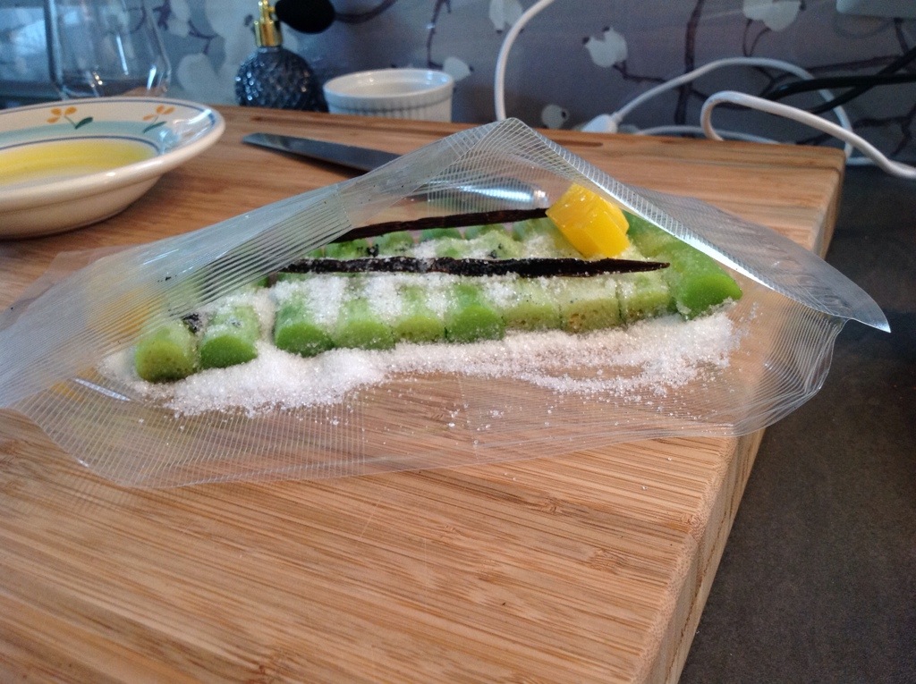 Jeg startet med rabarbra som en av hovedingrediensene i desserten. Still inn badekaret på 61 grader. Du trenger 150 gr rabarbra (skrell og del i 10 cm staver), 2 stk appelsinjuice isbiter, en stk vaniljestang og 40 gr sukker. Skrap ut frø fra vaniljestang og legg alle ingredienser i pose for vakumering slik: