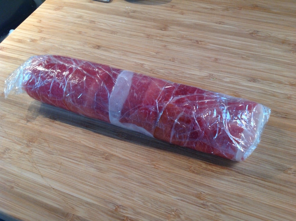 Først sous vide breiflabb. Her brukte jeg 500 gram som ble rullet inn i Parma skinke og deretter pakket stramt til pølseform i plastfolie.