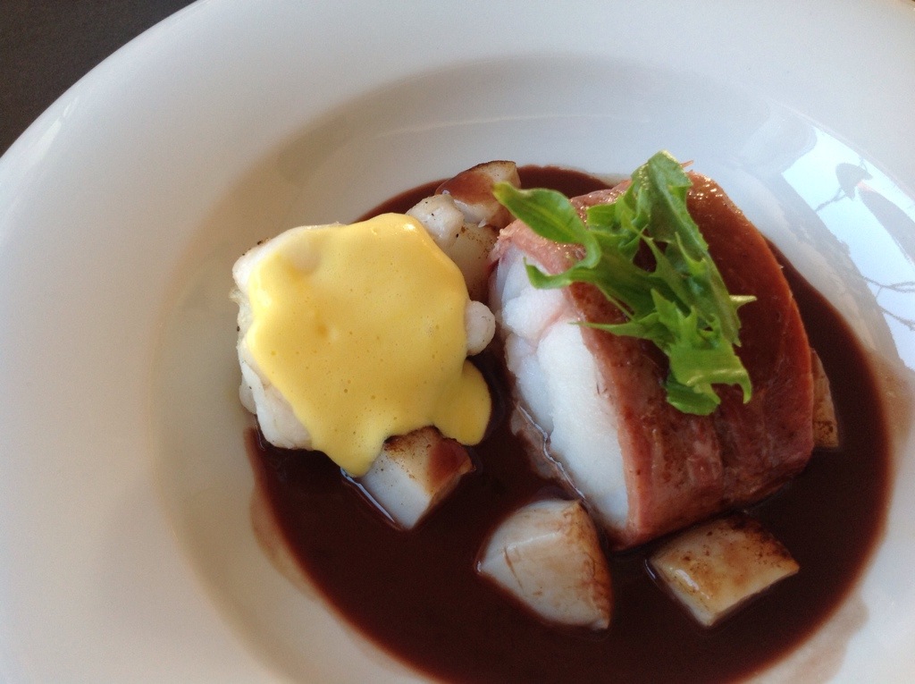 NÅ er du klar for å legge opp på tallerken. Jeg brukte dype. Legg først biter av kamskjell i bunn, hell på godt med saus, legg på et stykke med ovnsbakt breiflabb, et stykke med Parma breiflabb, sitron saboyenne monteres oppå den ovnsbakte breiflabben. Litt grønt på toppen. Sånn: