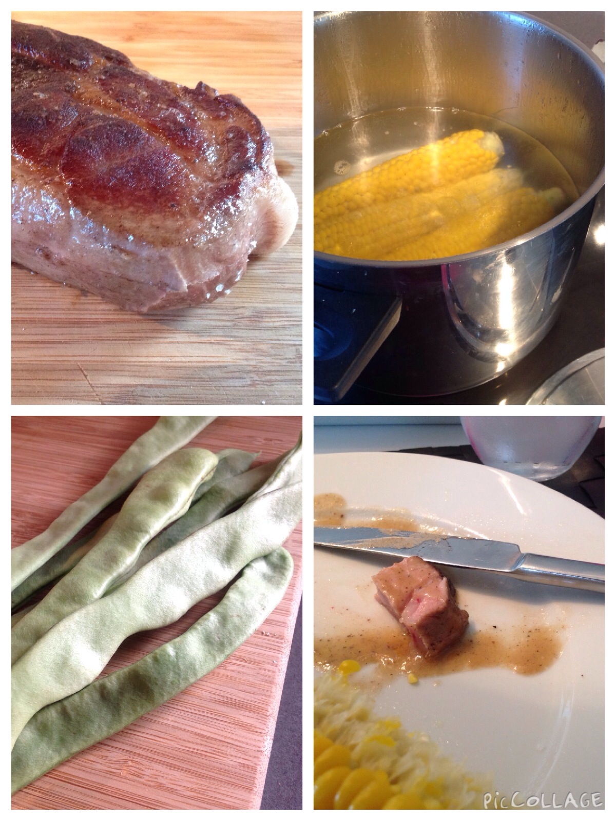 In short, shoulder butt in the sous vide for 24 hours at 60 degrees. Corn on the cob simmered in salted water for 10 minutes and I added the string beans with 3 minutes left. While this was cooking I poured the juices from the meat through a sieve, added half a cup of white wine, reduced with 1/3. Added a teaspoon of French mustard and 4 tablespoons of cream. Boil until the sauce thickens. Season with salt and pepper.