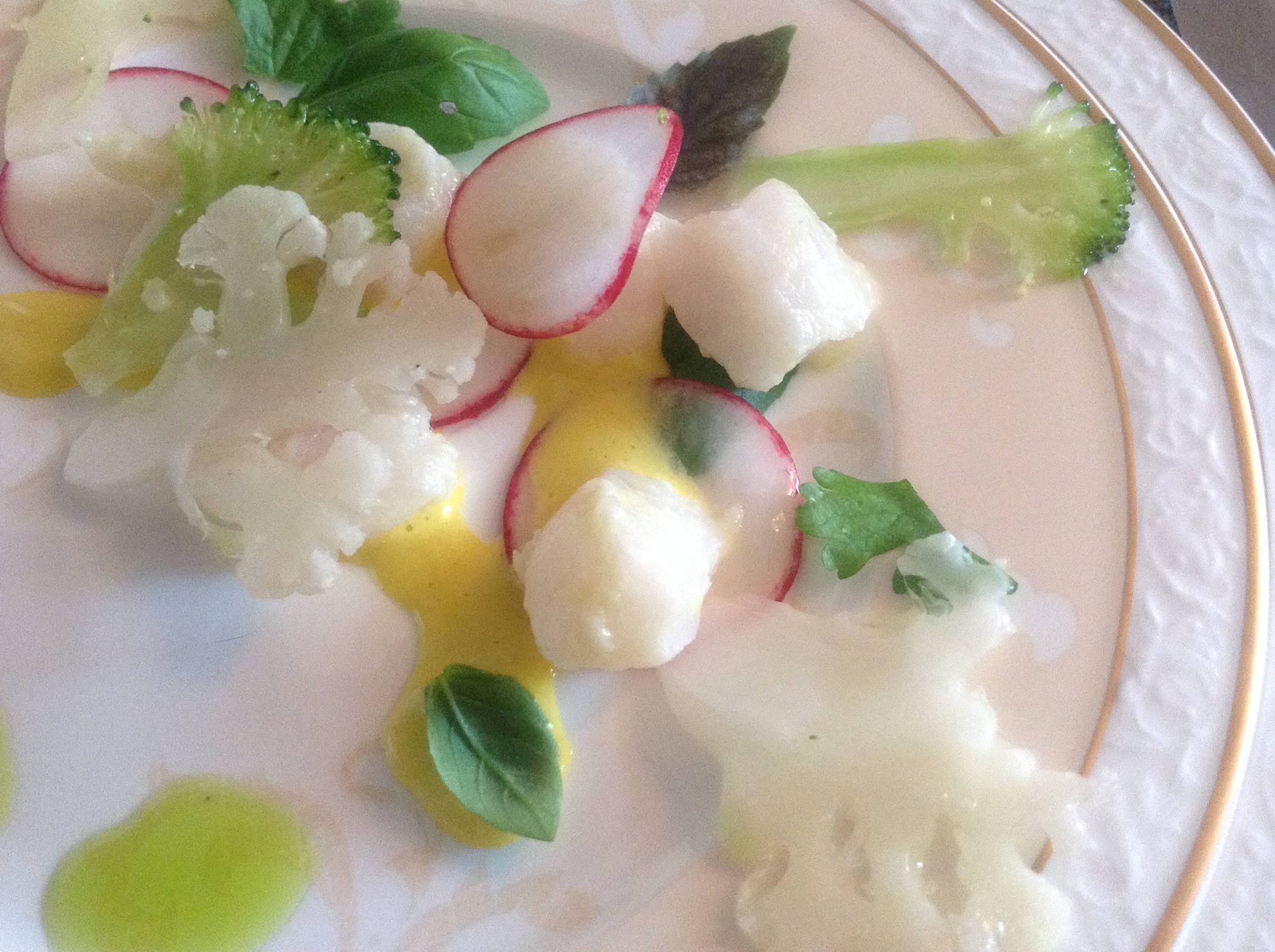 Forretten først…du trenger 400 g kveitefilet, 3-4 buketter med brokkoli, 3 reddiker, 3-4 buketter blomkål, sitron, 2 eggeplommer, 1 ts Dijon sennep, salt, pepper, frisk sitronmelisse og basilikum, 2 stk vårløk og nøytral olje.