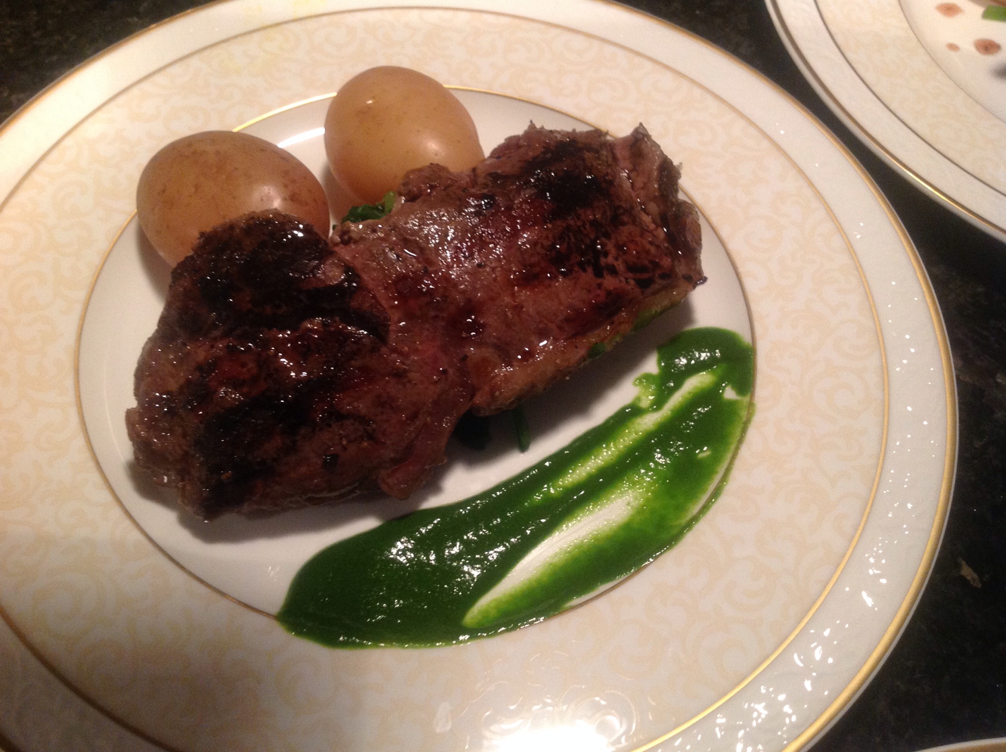 Fikk tak i en fantastisk ytrefilet med fettlokk og god marmorering. Denne fikk noen gode runder i bassenget, 90 minutter på 57 grader. Rett før servering valgte jeg å ha dem på grillen ca ett minutt på hver side. Nyyyyyydelig sammen med enkelt tilbehør. Jeg valgte blanchert spinat. Bladene får kose seg i kokende vann i ca 60 sekunder. Ha dem umiddelbart i isvann. Press ut vann og plasser midt på tallerkenen sammen med et par små poteter. Legg fileten oppå og legg på litt spinatsmør.