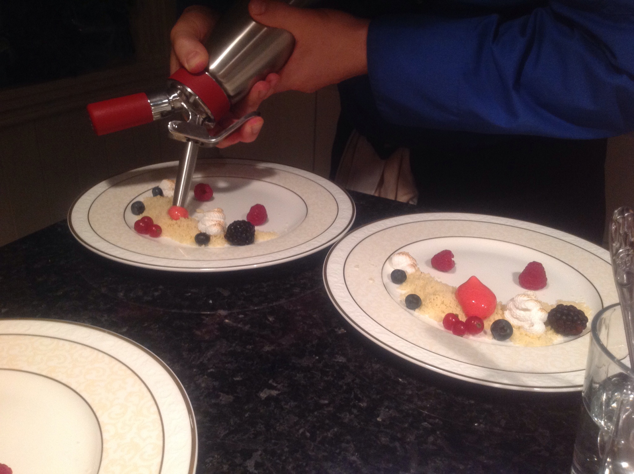 I denne menyen fikk jeg prøvd et mangfold av teknikker og ikke minst ble gaven fra kjæresten min (en etterlengtet spuma flaske) brukt til desserten. Thanks babe!
