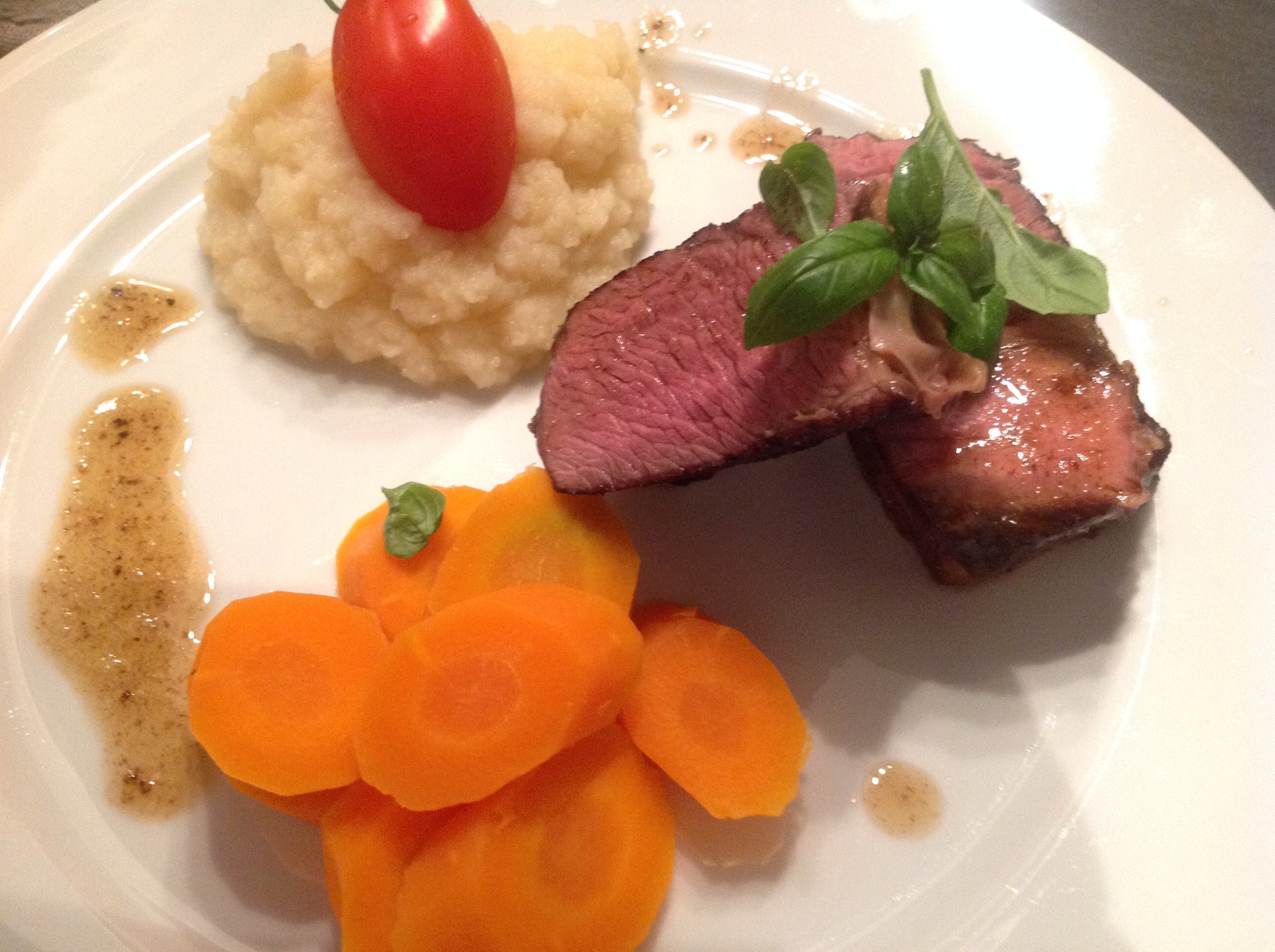 Okse høyrygg badet seg mør og god i bassenget i hele 29 timer på 60 grader. Kanongodt! Freste kjøttet i pannen med godt smør 1-2 minutter på hver side.