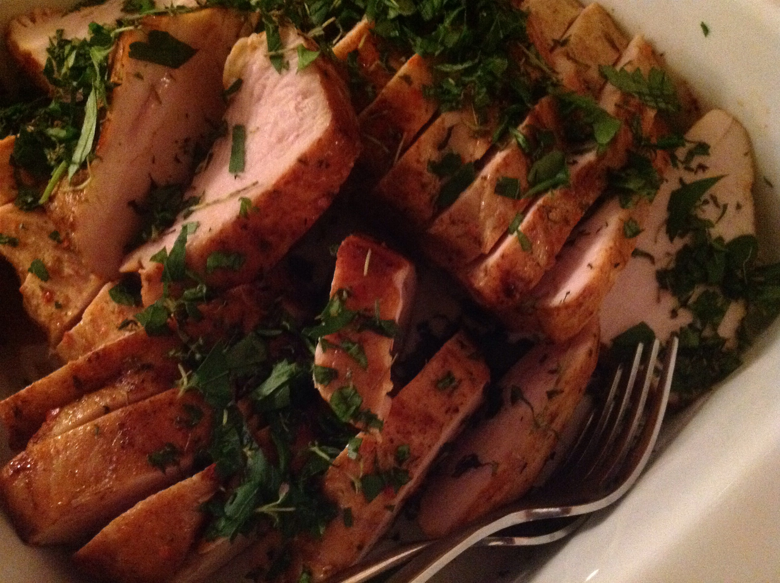 Varm opp bassenget og la kalkunbrystene utføre en 5 timers medley på 61 grader. Fres brystene i varm panne med smør et par minutter på hver side, la der hvile, skjær opp og server:-). Dryss over finhakket timian og bladpersille.