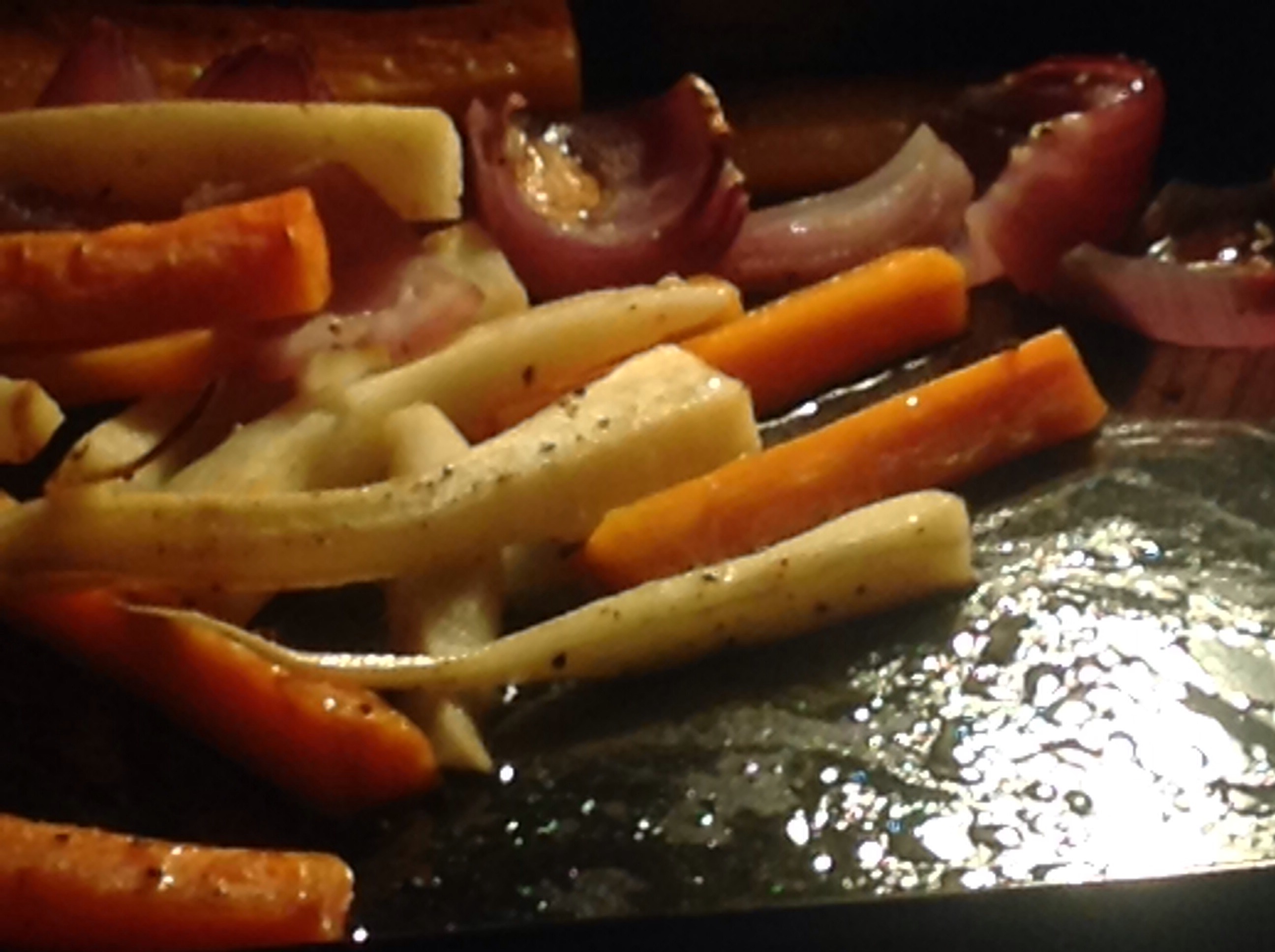 Når brystene dupper fint i bassenget forbereder du saus, poteter og grønnsaker. Skjær opp grønnsakene og løk i gode serveringsbiter og ha i en ildfast form. Ha på godt med deilig olivenolje. Stek i ovn på 220 grader i 40 minutter eller til møre.