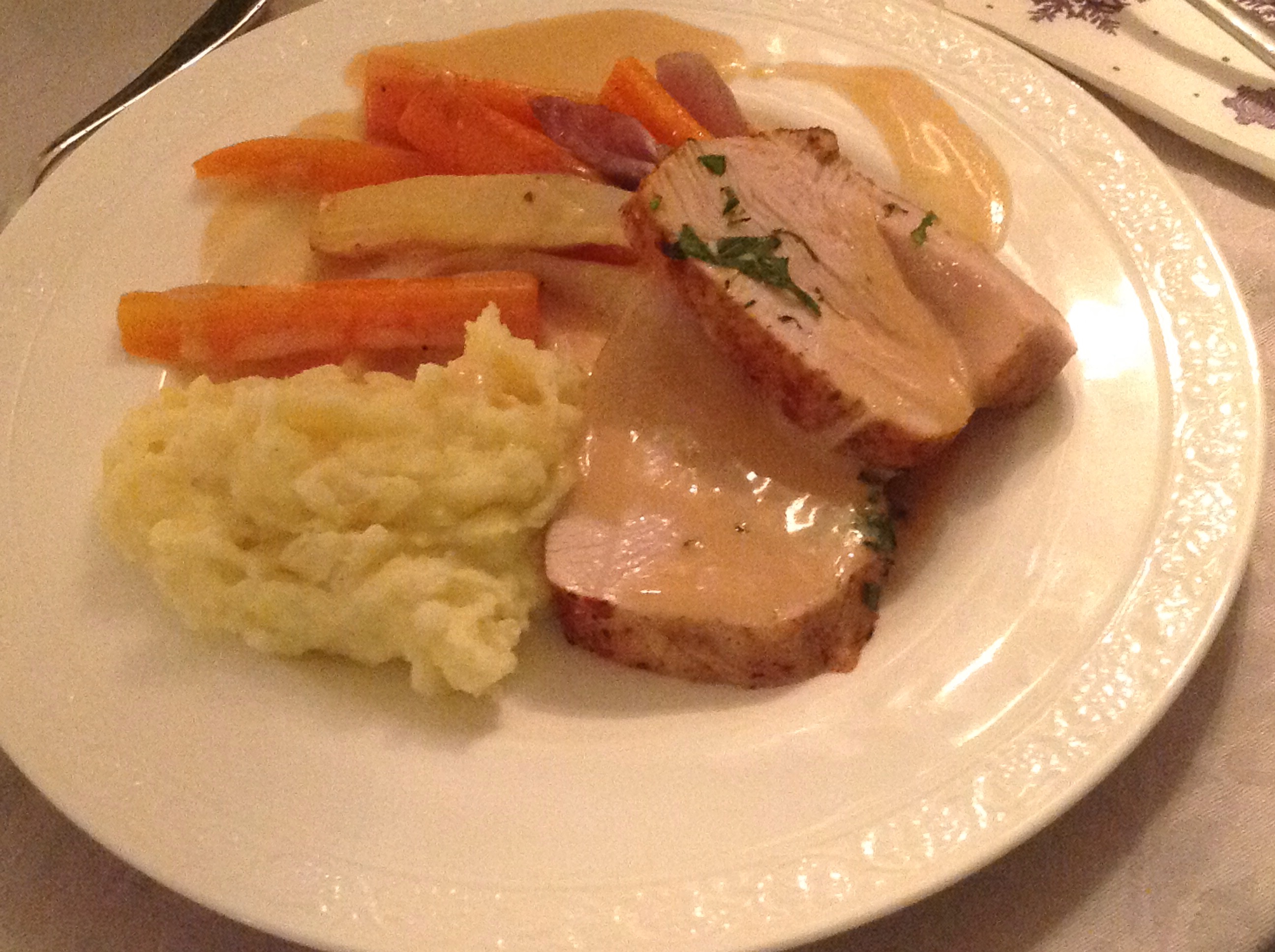 Kalkunbryst med ovnsbakte rotgrønnsaker, potetmos og hvitvinssaus. NAM!