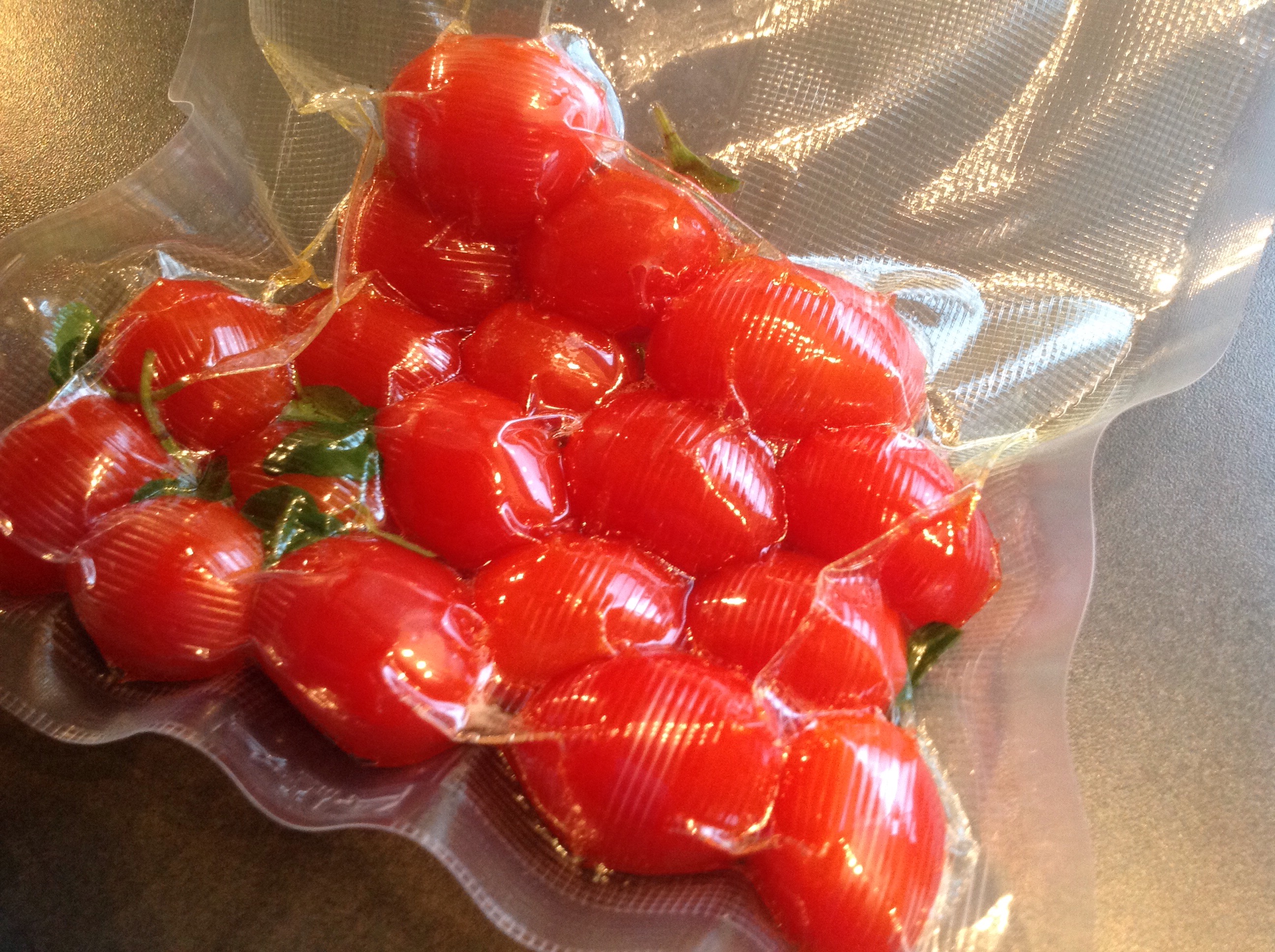 Deretter klargjør du tomatene. Legg disse i sous vide pose, ha i litt salt og pepper samt frisk oregano. Hell over et par spiseskjeer god olivenolje. Når svinepølsa har fått opp pulsen etter ca en time legger du i posen med tomater. Klages det på dårlig plass i bassenget overhører du det eller truer med familiebad i Klepp svømmehall (eller annet offentlig bad) kl 13 på søndager…det er definisjonen på dårlig plass i bassenget!