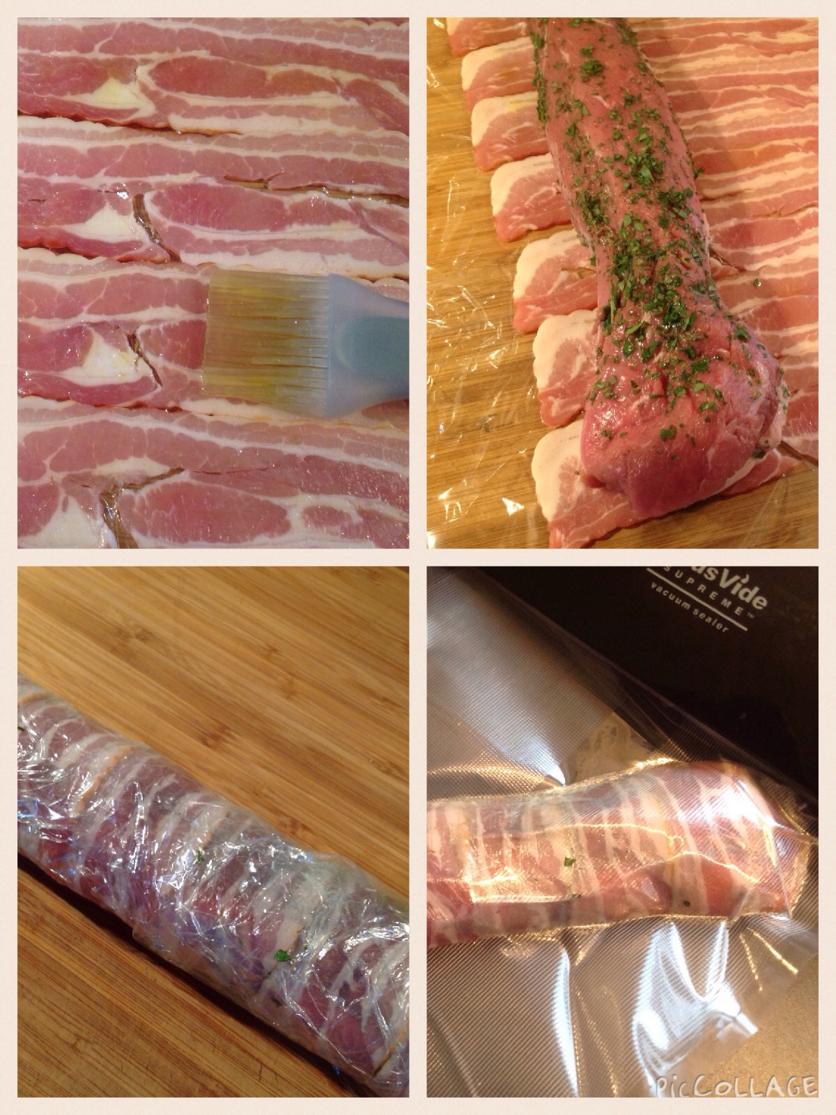 Start med å klargjøre indrefileten. Legg ut et stykke plastfolie på skjærebrettet og fordel skiver med bacon. Pensle disse med god olivenolje. Krydre fileten med salt, pepper og finhakket oregano. Rull fileten stramt med plastfolien…og vakumer svinepølsa. Minimum 2 og maksimum 3 timers svømmetur for pølsa!