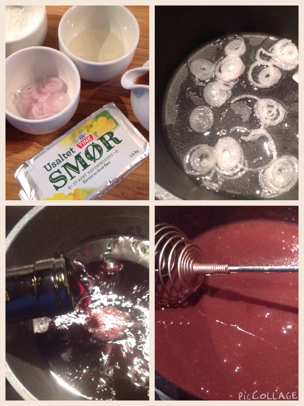 En liten sjallottløk i tynne, tynne skiver blankes og myknes i litt nøytral olje. Hell i 2 dl vin eller mer og kok inn til sirup. Ha i 2,5 dl kyllingkraft og kok inn til sausen tykner. Sil den. Ha i et par spiseskjeer usaltet smør. Smak til med en spiseskje god sennep, salt og pepper – mmmmmm. Når fileten er ferdig heller du oppi litt av kjøttkraften gjennom en sil!