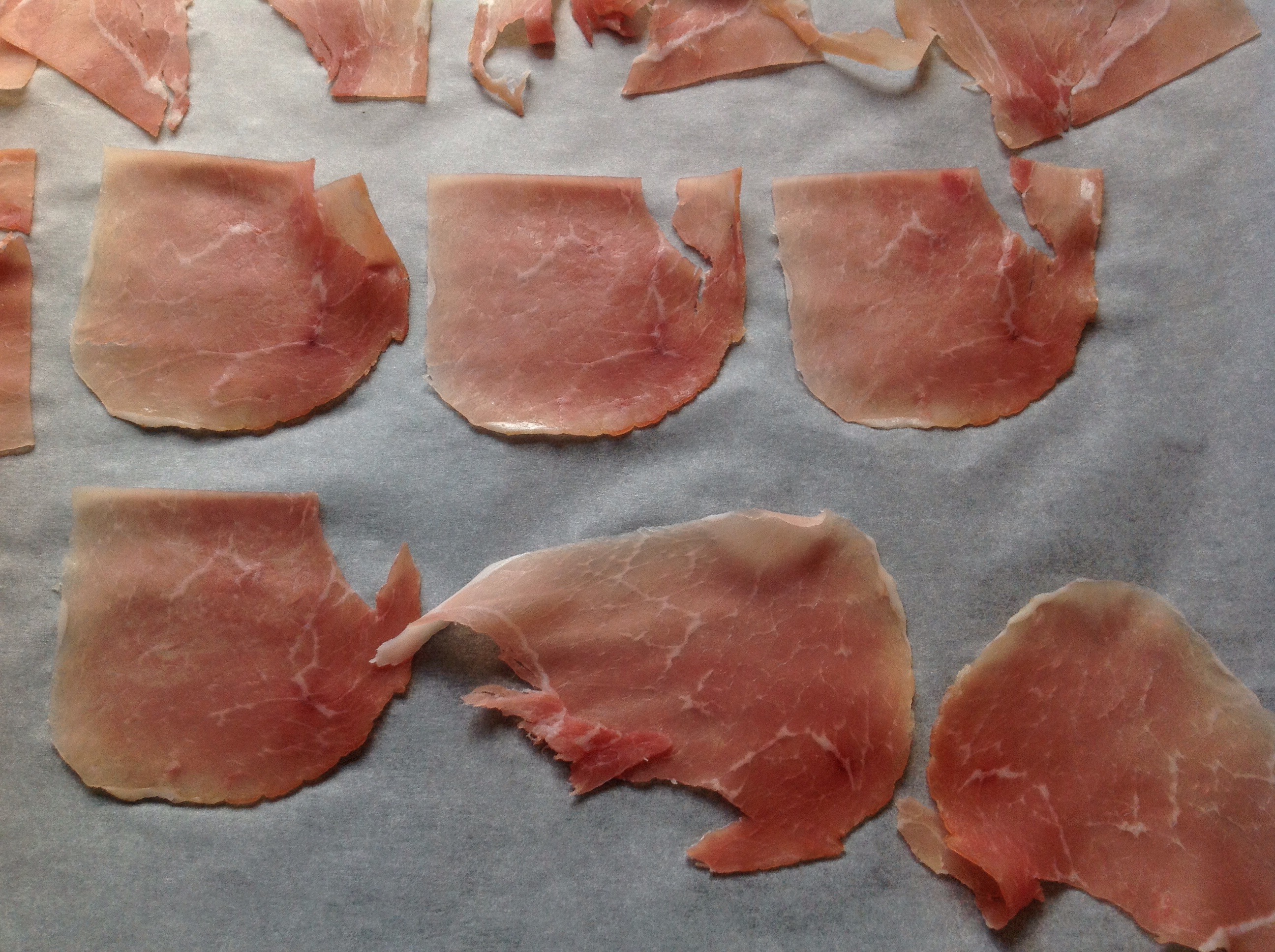 Del skivene med skinke og fordel på en stekepanne kledd i bakepapir. Stek sprø i ovn på 190 grader i 8-10 minuttet. Sett til side og bruk som garnityr.