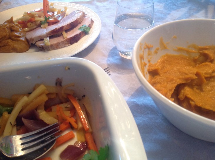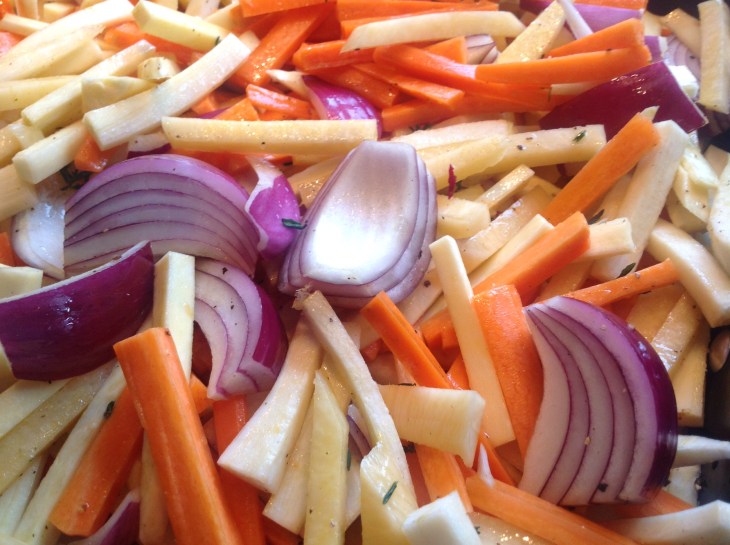 Av grønnsaker valgte jeg gulrot, kålrabi, persillerot og pastinakk. Disse skjærer du opp i fine staver…tar litt tid, men resultatet blir delikat og ikke minst godt. I tillegg brukte jeg to rødløk delt i båter. Bland alt i en langpanne, ha i godt med god olivenolje og bak i ovn på 180 grader til grønnsakene er møre. Her må det etter min mening være litt tyggemotstand:-)