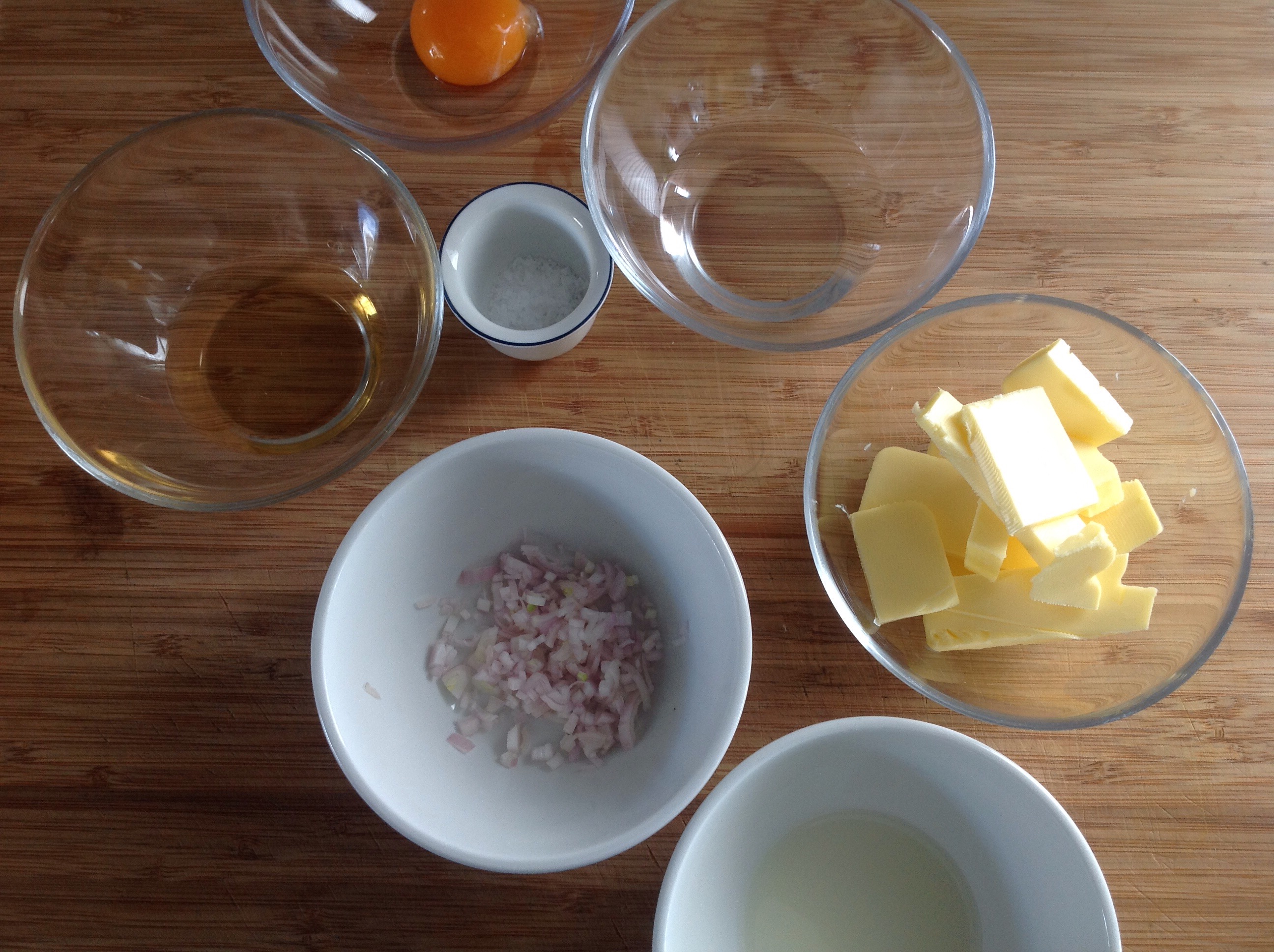 1 gram flaksalt, 75 gram smør, 30 gram vann, 10 gram sitronsaft, 20 gram hvitvinseddikk, 42,5 gram eggeplomme og 13 gram finhakket sjallottløk.