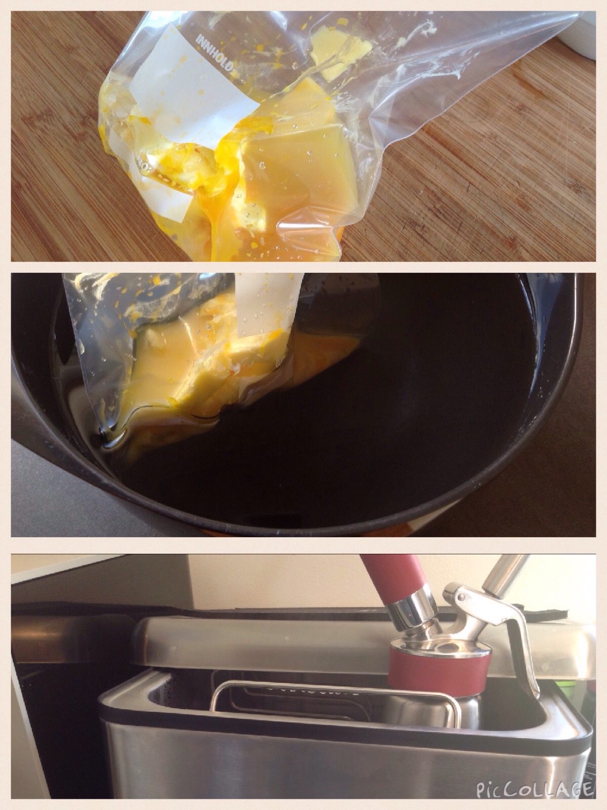 Sviddå bruker litt tid på å jobbe opp solide 75 grader og posen får kose seg der i 30 minutter. Etter svømmeturen valgte jeg å ha væsken i en boks og kjørte den glatt med en stavmikser. Deretter helte jeg væsken i spuma flasken, tilføre en patron med gass, ristet og satte flasken i sviddå for å holde den klar til servering. Her er det viktig at temperaturen ikke overstiger 72 grader eller kommer under 68 da du risikerer at sausen skiller seg. Still inn badet på 69 og sett flasken oppi når temperaturen har sunket til under 72.