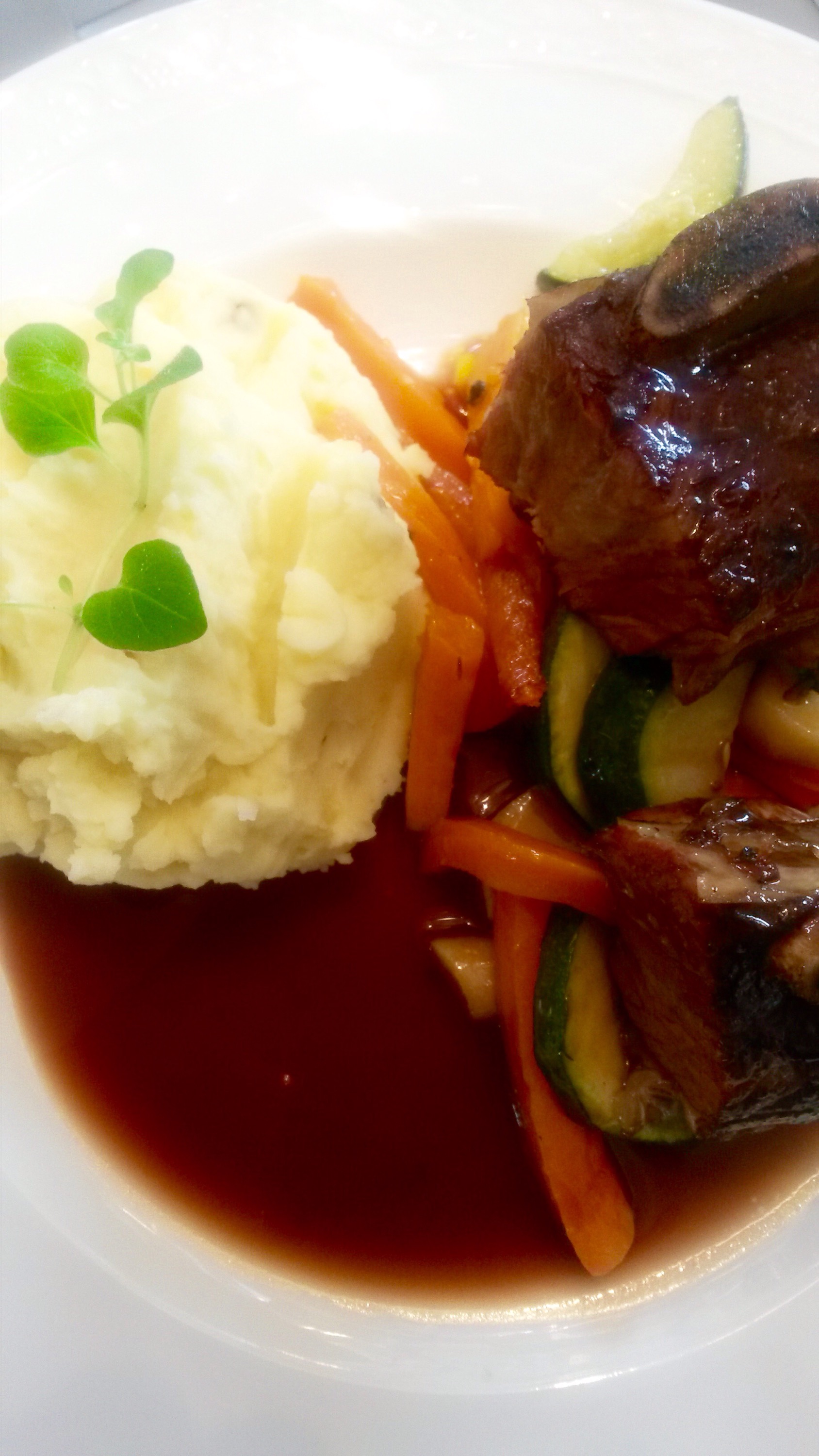 Okseribbe sous vide med potetstappe, ovnsbakte rotgrønnsaker og squash med en fyldig rødvinssaus. Nam, nam sa alle og sånn så den ut på tallerkenen.