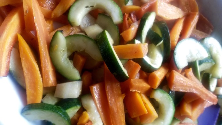 Når det gjelder grønnsaker kan du velge det du har tilgjengelig. Vi hadde gulrøtter, søtpotet, persillerot og squash i kjøleskapet. Skrell alt og del i biter…sånn noenlunde samme størrelse. Bland med olivenolje og ha i frisk oregano eller annet krydder som du har. Forvarm ovnen til 200 grader. Ha gulrøtter og persillerot i en ildfast form og la disse bake i 15 minutter før du tilsetter søtpotet. La dette fortsette ca 15 minutter til og ha til slutt squash i formen. La det hele fortsette å bake til alt er mørt med tyggemotstand.