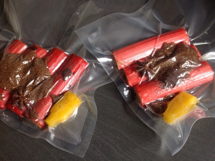 Fordel rabarbra, frossen appelsinjuice, brunt sukker, vanilje og stjerneanis i to vakumposer. Slipp posene fri i bassenget som skal holde 61 grader. Svømmingen stopper du etter 1 1/2 time men det gjør ikke noe om de koser seg der i to timer heller.