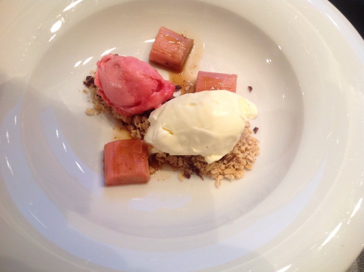 Rabarbra liker jeg å bruke som en av flere komponenter i desserter. Til denne som ble laget til fire voksne personer fant jeg fram 10 gram mørk sjokolade i tynne skiver, 80 gram crumble (jeg brukte en glutenfri variant som heter Kick), 250 gram rabarbra i 10 cm biter, to juicebiter (appelsinjuice frosset i isbitform), frø fra en vaniljestang, 2 stk stjerneanis, 50 gram brunt sukker, iskrem etter smak og behag (jeg gikk for bringebær sorbet og vaniljeis)
