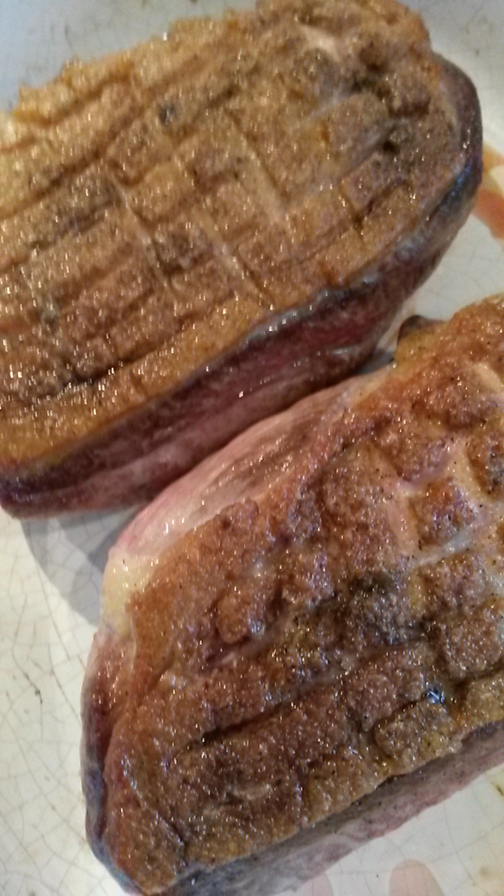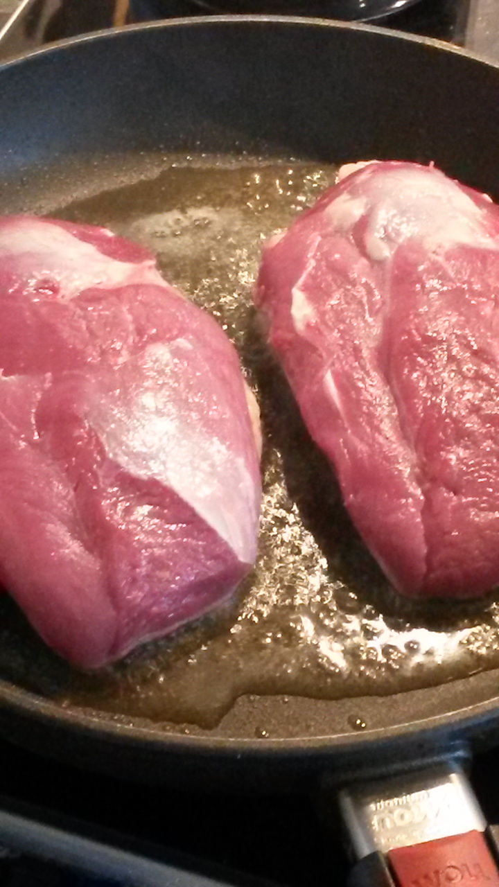 Andebrystene tørkes med papir og du snitter opp svor i fint mønster. Stek med skinnsiden ned I varm panne I ca 4 minutter. Snu og stek på kjøttsiden I ett minutt. Ta vare på andefettet for smakstilsetning til sausen. La brystet hvile.