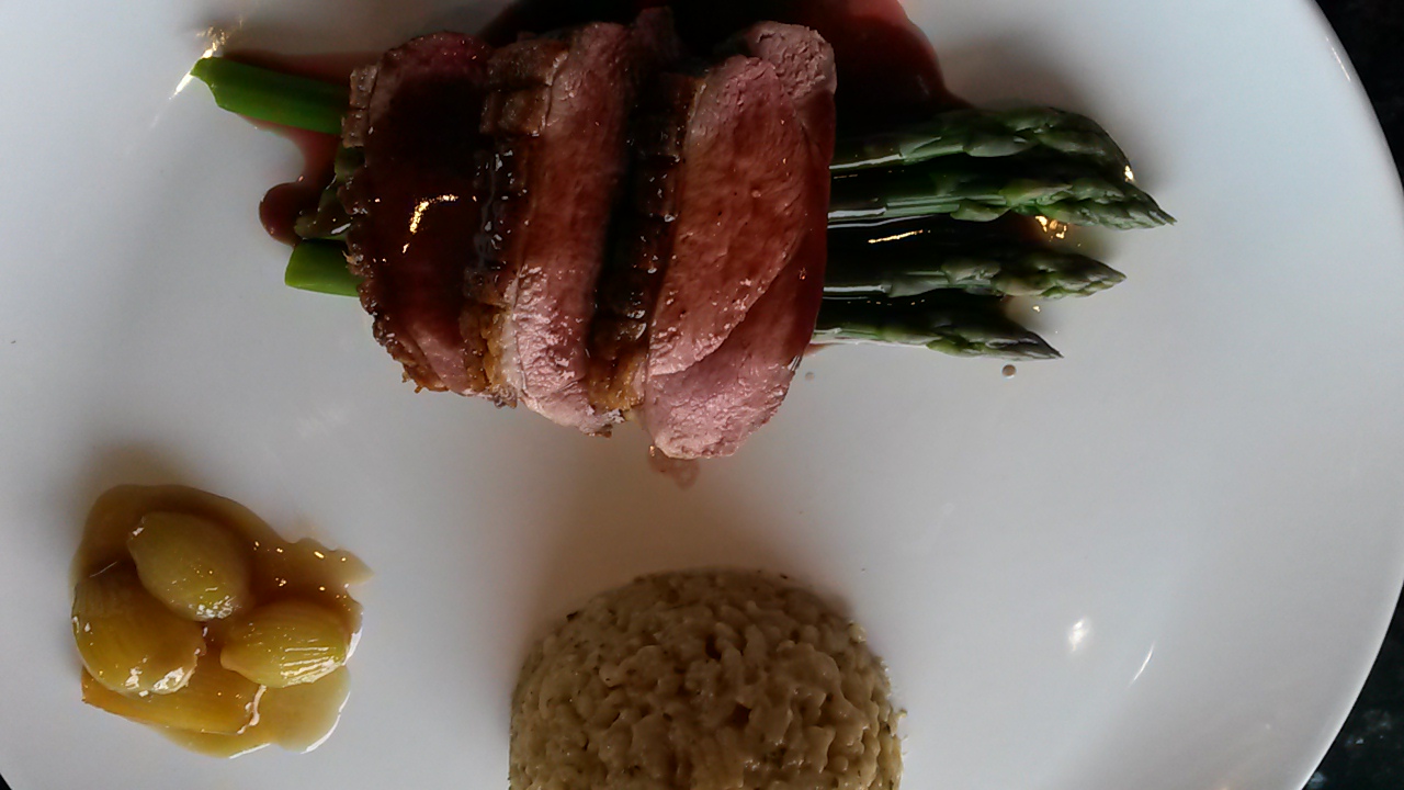 Pannestekt andebryst med karamellisert løk, blansjert asparges, risotto og bjørnebærsaus.