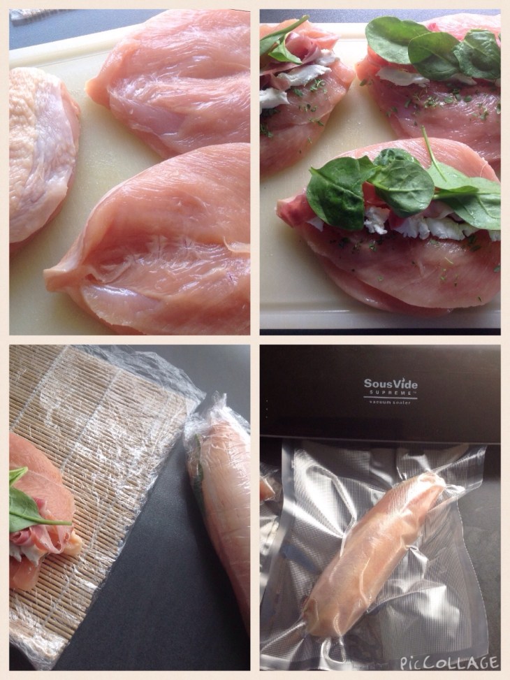 Denne retten byr på fantastiske smaker og er relativt enkel å tilberede. Bruk en skarp kniv og skjær nesten igjennom brystet og brett ut. Legg på fyll og bruk en sushi matte til å rulle brystene sammen. Viktig for senere varme behandling at skinnet kommer ut. Pakk brystpølsene tett og hardt i plastfolie og vakumer (se bilder nedenfor). La de fylte brystene duve og plaske i bassenget i behagelige 60 grader i 90 minutter.
