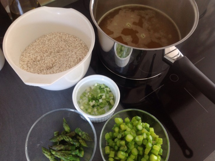 Skrell asparges og ha dem i fosskokende vann med litt salt. Kok i 2 minutter og kjøl raskt ned under kaldt vann. Tørk og del stenger i ca halv cm biter. Behold aspargestoppene. Dette tilsetter du risottoen rett før servering.