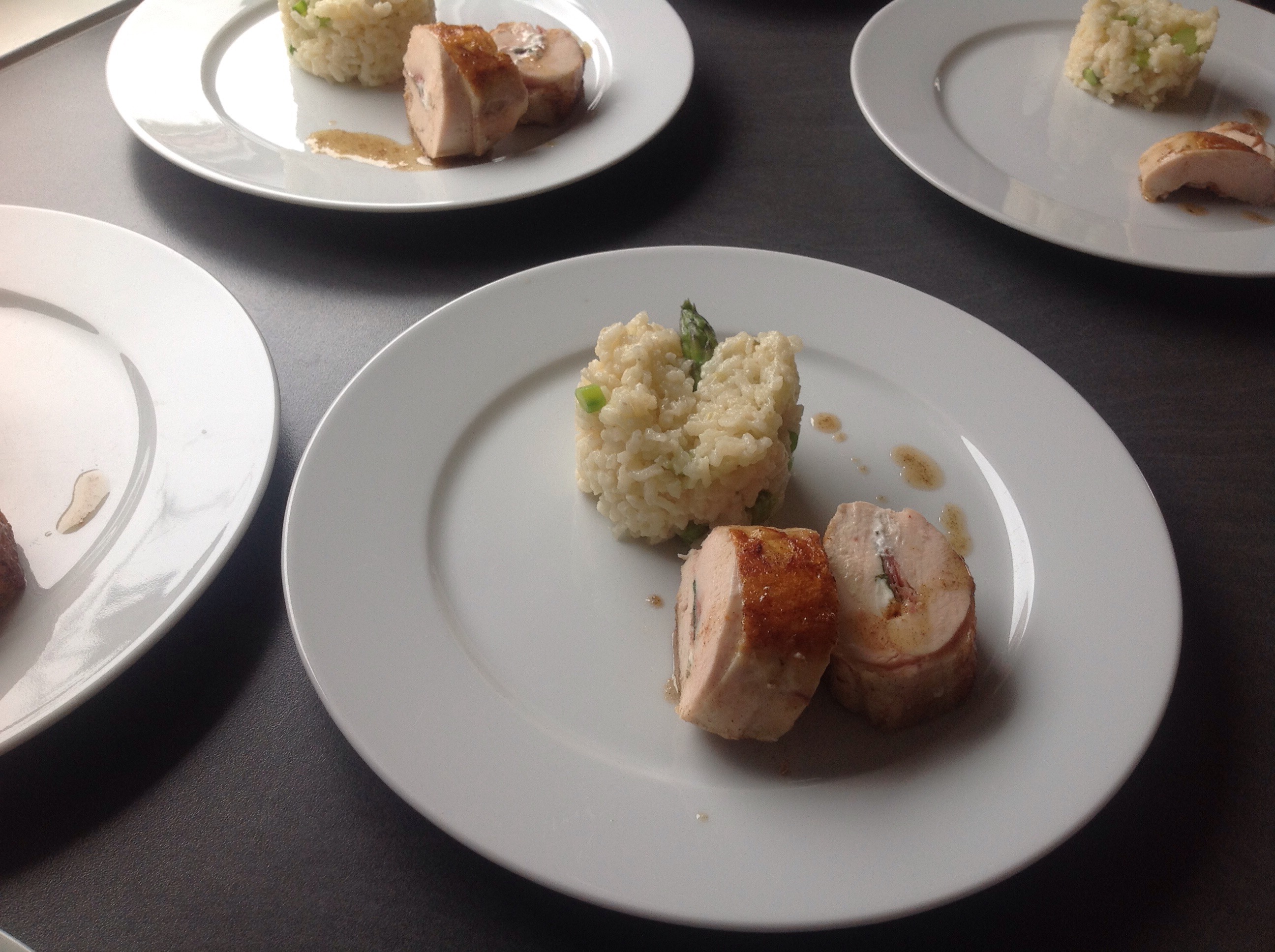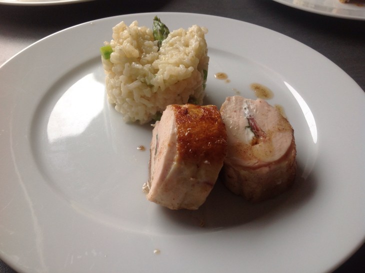 Kyllingbryst fylt med serranoskinke, chevré ost og spinat servert med asparges risotto og salat.