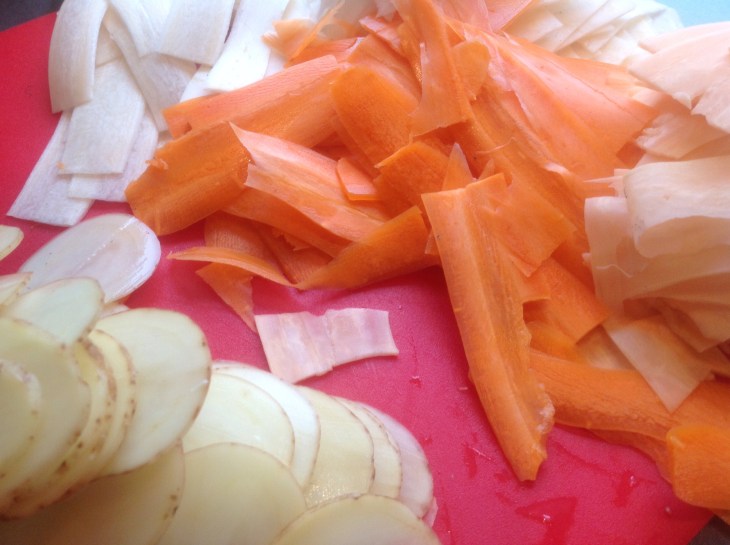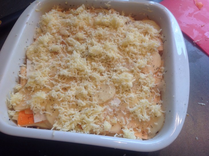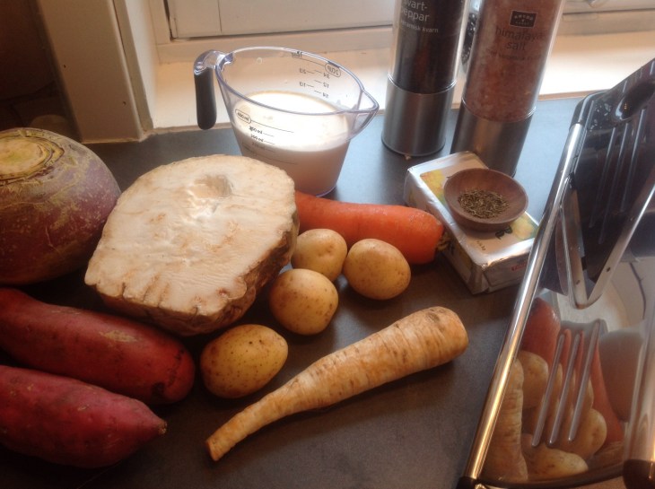 De beste rotgrønnsakene finner jeg på gårdsutsalg – rett fra moder jord. En bonus for oss er at det som ligger noen steinkast unna oss har søndagsåpent. Til gratengen kan du velge de rotgrønnsakene du setter mest pris på…jeg har litt problemer med å velge så jeg kom hjem med seks ting å skjære i tynne skiver fra utsalget; kålrot (1/4 del), gulrot (1 stk), persillerot (1 stk), sellerirot (1/2 rot), søtpotet (2 mellomstore) og poteter (4 små poteter). Du må justere på mengde avhengig av antall munner som skal mettes og lager du etter disse målene så har du garantert litt rester til dagen etter. I tillegg til dette trenger du noen tynne skiver smør, litt tørket timian, 2 dl fløte, 3 dl melk, ca 100 gram revet ost samt salt og pepper.