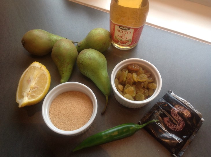 Når gratengen er i ovnen starter du med å forberede pærechutney. Finn fram alle ingrediensene; 4 stk pærer, 1 dl gule rosiner, 200 gram brunt rørsukker, 1 dl eplecidereddik, 1 ts malt anis, 1/2 sitron, en grønn chili og en klype salt.