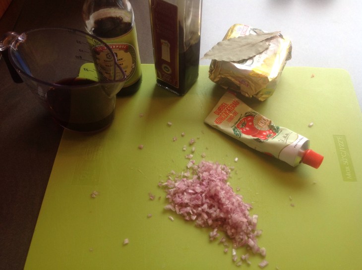 Fres sjalottløk myk og blank i en ss smør. Tilsett tomatpurè og la dette kose seg i gryta et par minutter. Ha i rødvin, vann, kraft, soyasaus og balsamico…kok opp. Tilsett laurbærblad og tørket sopp og la sausen koke med til det halve eller til den begynner å tykne. Rør inn smør mot slutten og smak til med pepper. Hold varm til servering og husk å fjerne laurbærblad og opp før du monterer.