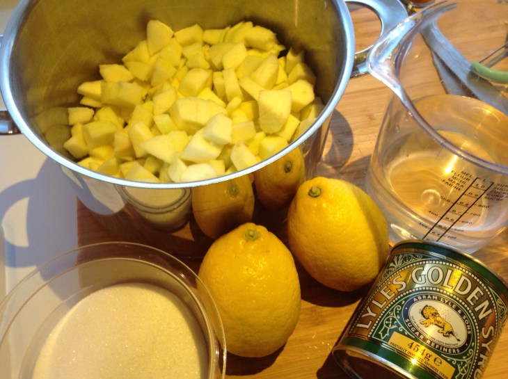 Til eplesorbet trenger du 4 syrlige epler, 150 g sukker, saft av 2 sitroner, 1 ss Golden sirup, et par dråper eple essens og litt grønn farge hvis du har lyst til å servere sorbet med flott farge:-)