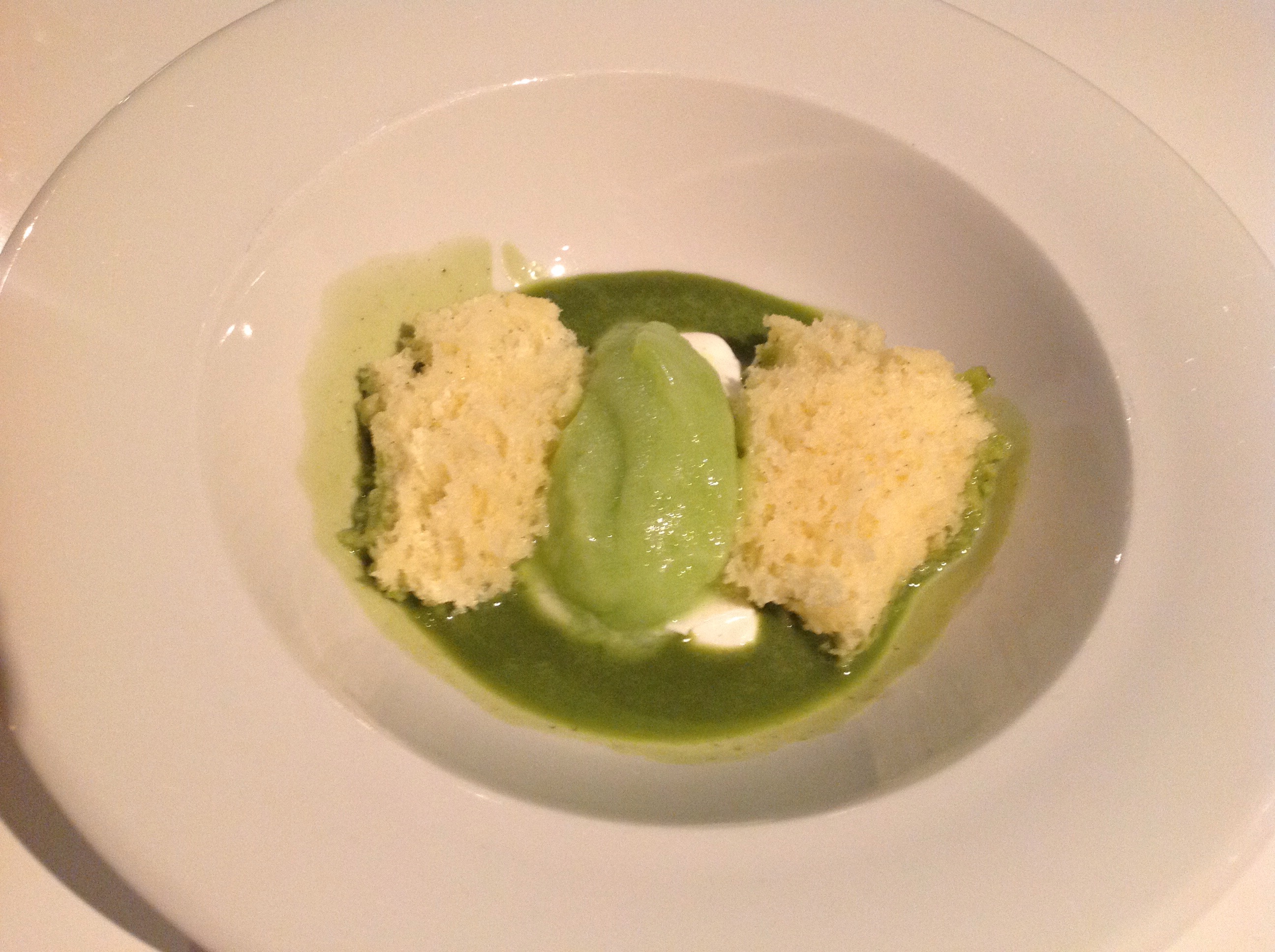 Denne gang ble jeg så inspirert av desserten at jeg ville lage en variant sammen med mine gode venner i Chefs Gourmet Club som kokkelerer sånn omtrent annenhver måned. Etter å ha tenkt meg nøye om og diskutert med min kjære ble vi enige om at elementene i denne kreasjonen var syrlig eplesorbet, naturell youghurt, vaniljekake og en saus basert på grønn te – en funky høstdessert rett og slett.