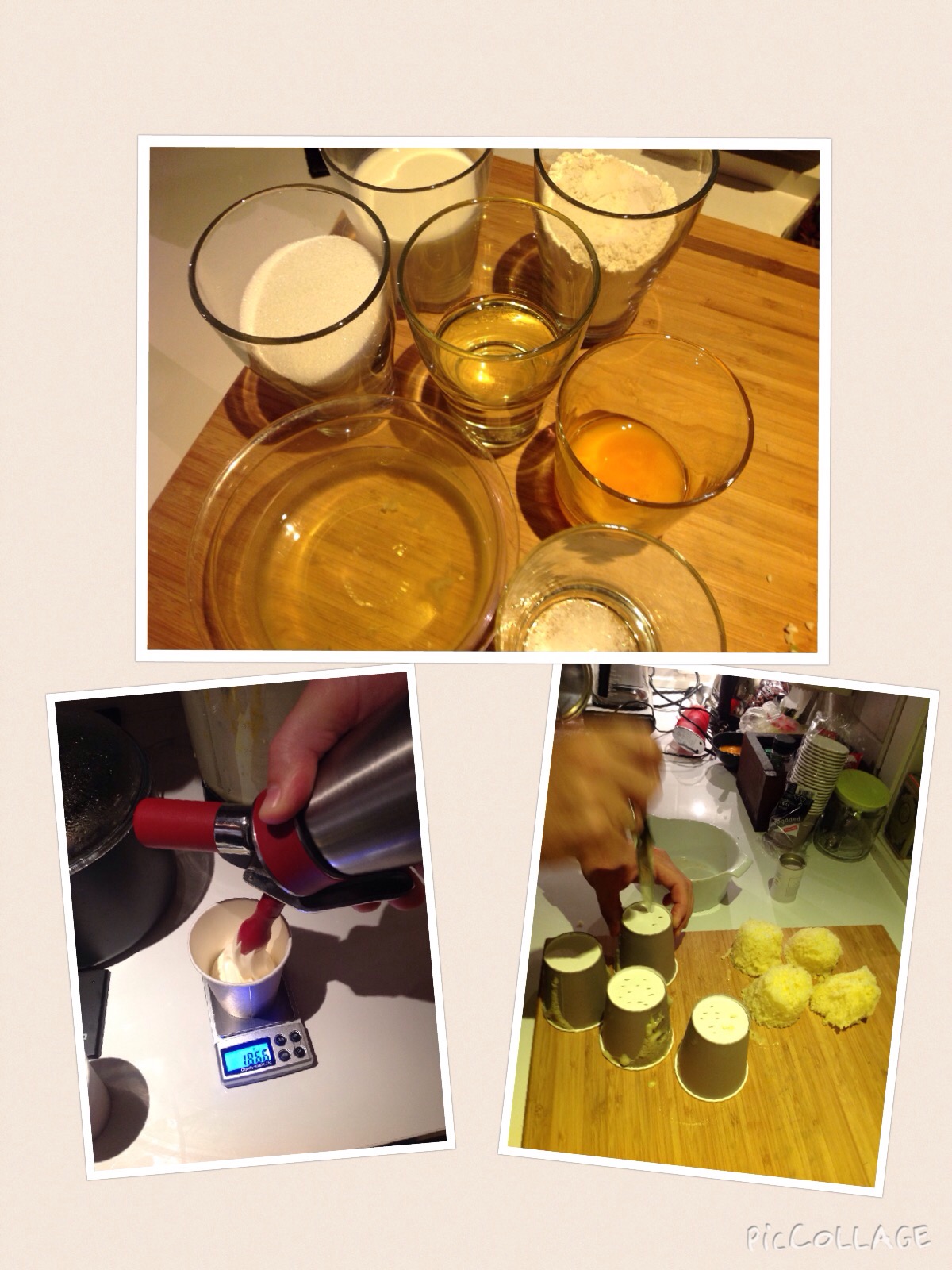 Ha alle ingrediensene i en blender. Trikset her er å begynne med de våte elementene for å hindre at ting setter seg fast i blenderen. Kjør til en fin og glatt røre. Nå kan du ta fatt på det som er virkelig gøy. Finn fram spuma flasken, fyll på til maksimum nivå og lad med en patron. Rist hemningsløst i 30 sekunder og fyll røre i pappbegre, nærmere bestemt 45 gram i hver. Det enkleste er å sette koppen på vekten mens du fyller. Sett koppene i mikrobølgeovnen og nuke dem i 38 sekunder på 1100 watt og voila…kake ferdig:-)