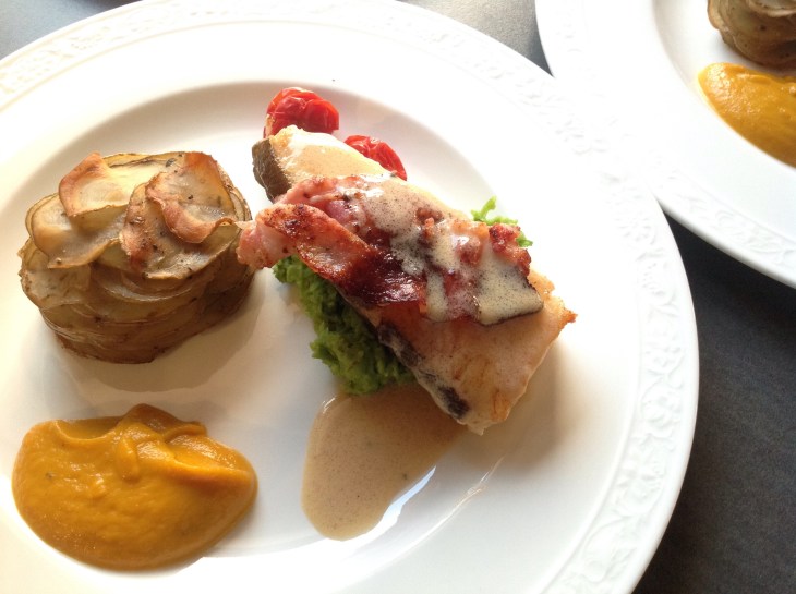 Legg opp på varme tallerkener. Begynn med potetene, legg så en skje med ertestuing hvorpå du plasser fiskestykket. Sprøstekt bacon på topp, en skje med karamellisert gulrotpuré, en dæsj med champis saus og et par cherry tomater….and you are ready for a Sunday treat!!!