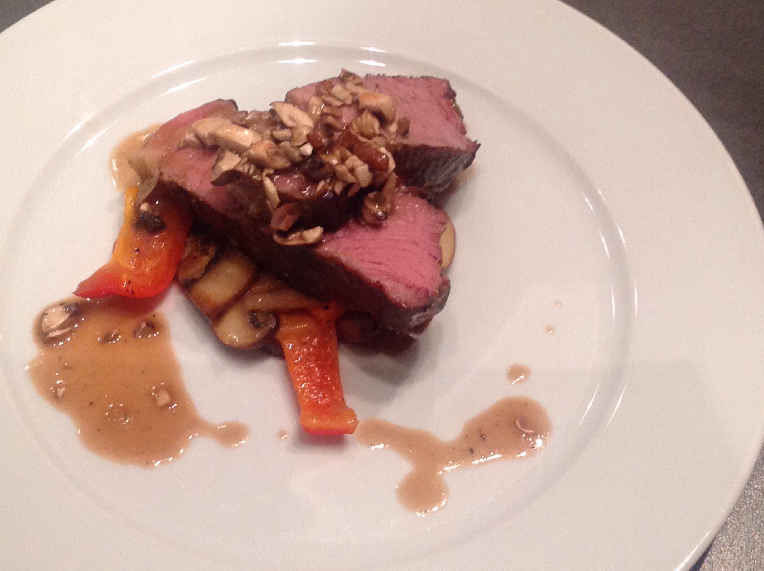 Sausen begynner du på først. Ha 2,5 dl oksekraft (Jakobs) i en gryte og kok inn til den tykner. Hell i en skvett rødvin og kok videre i ca 10 minutter. Legg i et par hvitløksbåter for smakstilsetning. Rett før servering tilsetter du noen dråper Worchester saus, en skvett fløte og et par spiseskjeer usaltet smør. Smak til med salt og pepper. Tilsett hakket aromasopp og finhakket hvitløk (1 fedd). Resultat: fenomenal saus!