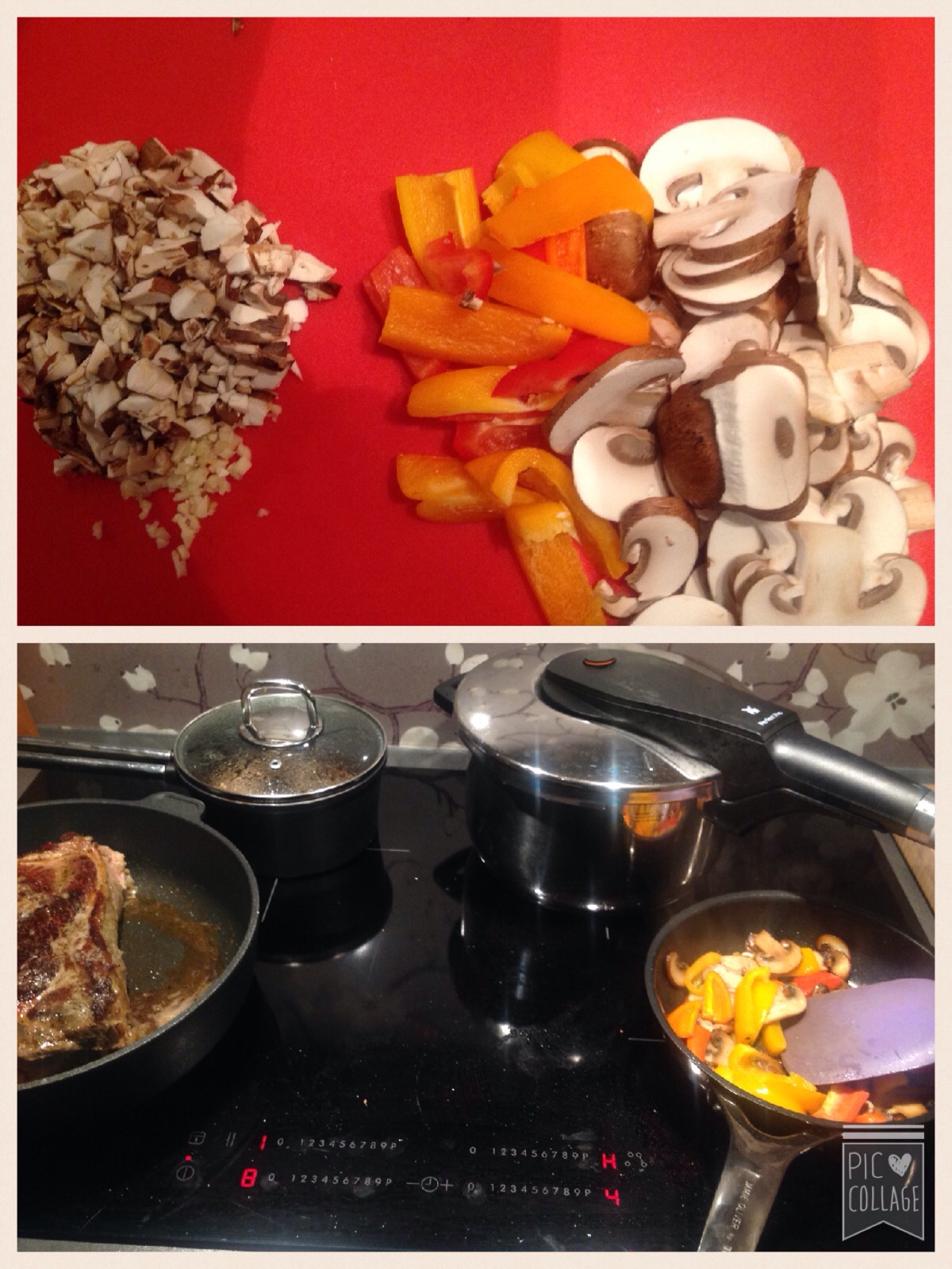 Tilbehøret er av den enkle sorten; pannestekt aromasopp og paprika samt kokte poteter. Skjær sopp og paprika i passelige skiver. Stek i panne med smør og olje. Potetene trykkoker du i 8 minutter.