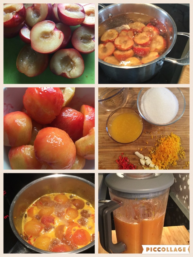 Til sausen trenger du følgende: 8 plommer, 2.5 dl sukker, 1 dl hvitvinseddik, 2 ss revet ingefær, revet skall fra en appelsin, juice fra en appelsin, 1 1/2 finhakket rød chili (fjern frø) og 2 hvitløksfedd i grove biter.