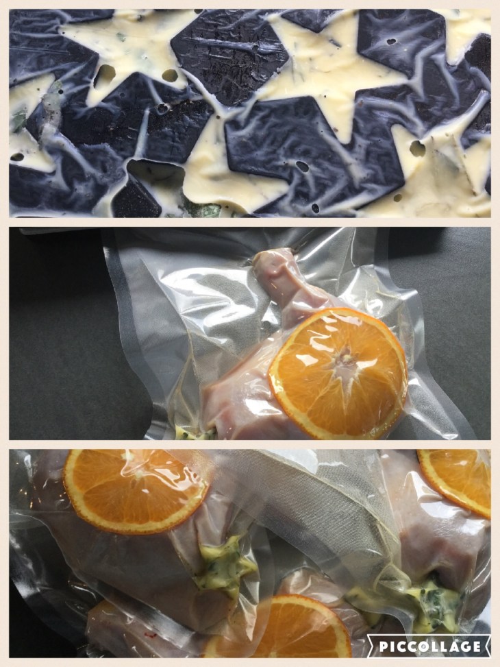 Til 4 personer trenger du 4 stk voksne kyllinglår (for eksempel fra Stange), 4 appelsinskiver, et par frosne olje og urte isklumper. Lærte nemlig et suverent triks på ChefSteps som gjør vakumering til en drøm når du trenger rikelig med væske sammen kjøttet. Finhakk friske urter og dryss i isklumpformer. Fyll opp med god olivenolje og frys. Disse kan du ha i fryseren lenge, til glede for store og små ganer. Du kan bruke hva som helst av urter, og til denne retten valgte jeg oregano, med visshet om at jeg har både timian og rosmarin i fryseren til fremtidige retter.