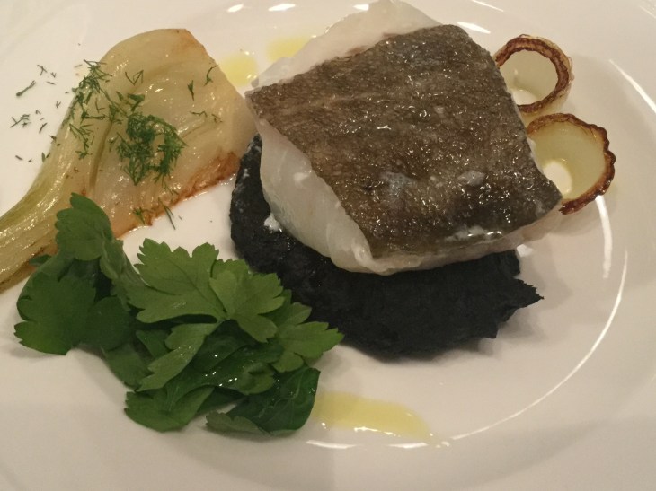 Retten som ble servert til 4 personer ble høytidelig døpt til : Skrei på kulørte linser, appelsinglasert fennikel, pannestekt sjalottløk og persillesalat.