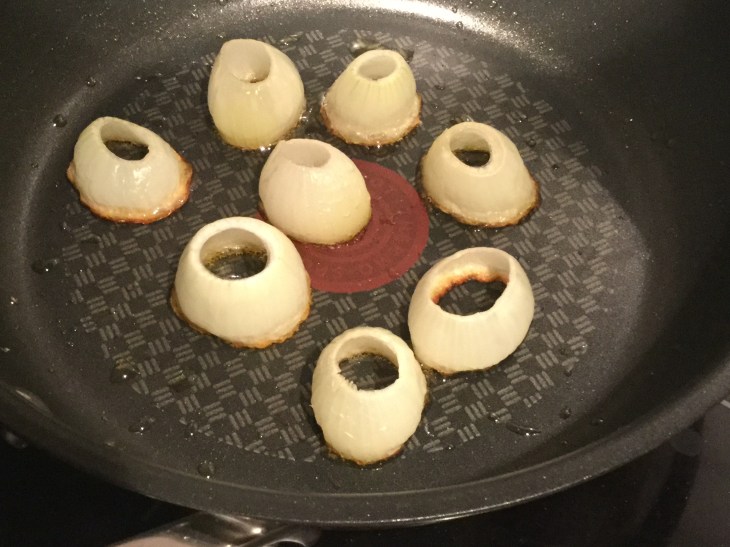 Sjalottløk skrelles, deles i to for så å separere lagene. Sett dem med bredeste del ned i panne med litt olje. Stek til de er møre helt til topps.